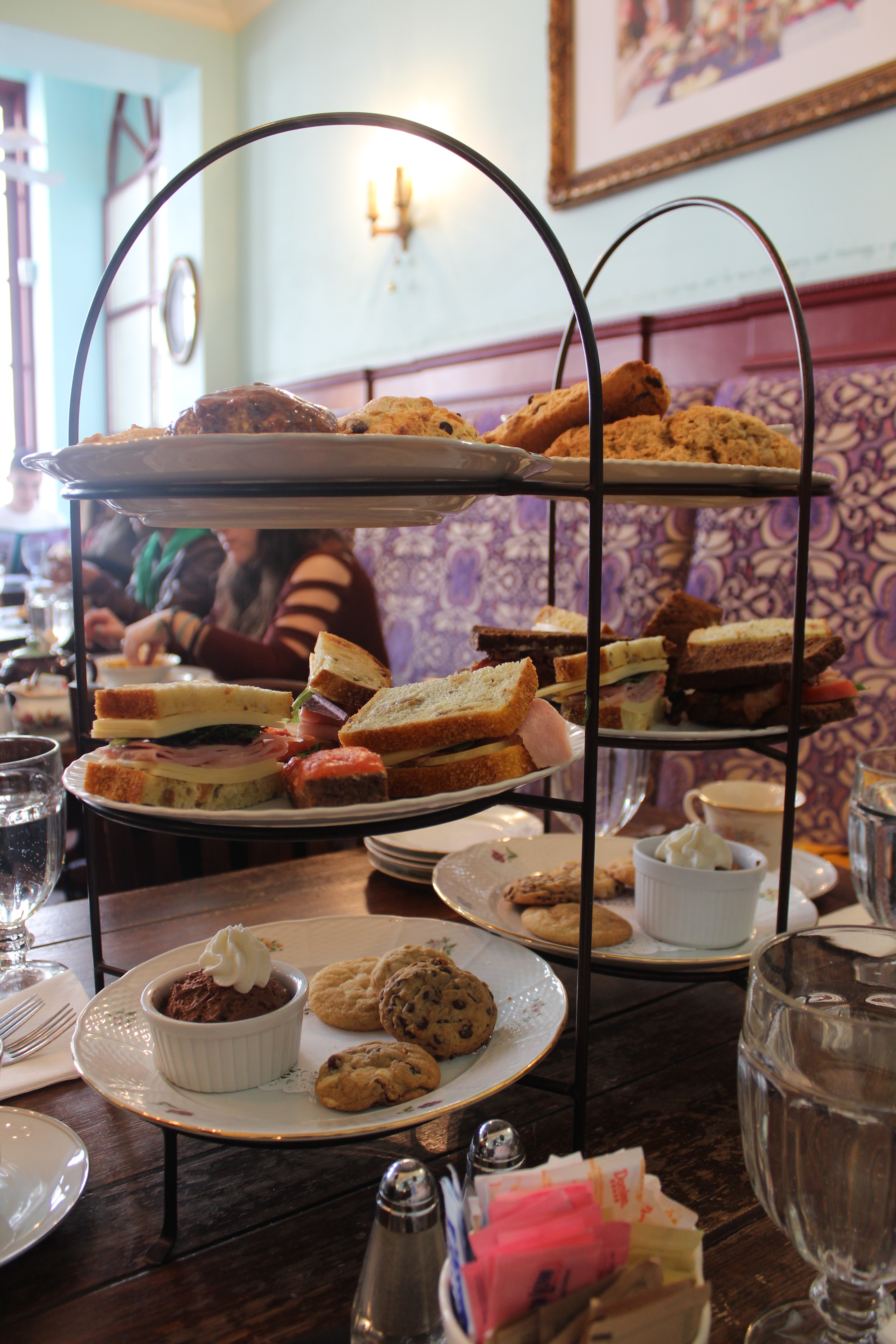 My sister and I decided to share The Mad Hatter afternoon tea set for two ($45). It comes with two pots of tea, your choice of three scones, your choice of two sandwiches, assorted cookies and your choice of dessert. The tea sets come in a three-tier stand, which was so cute!