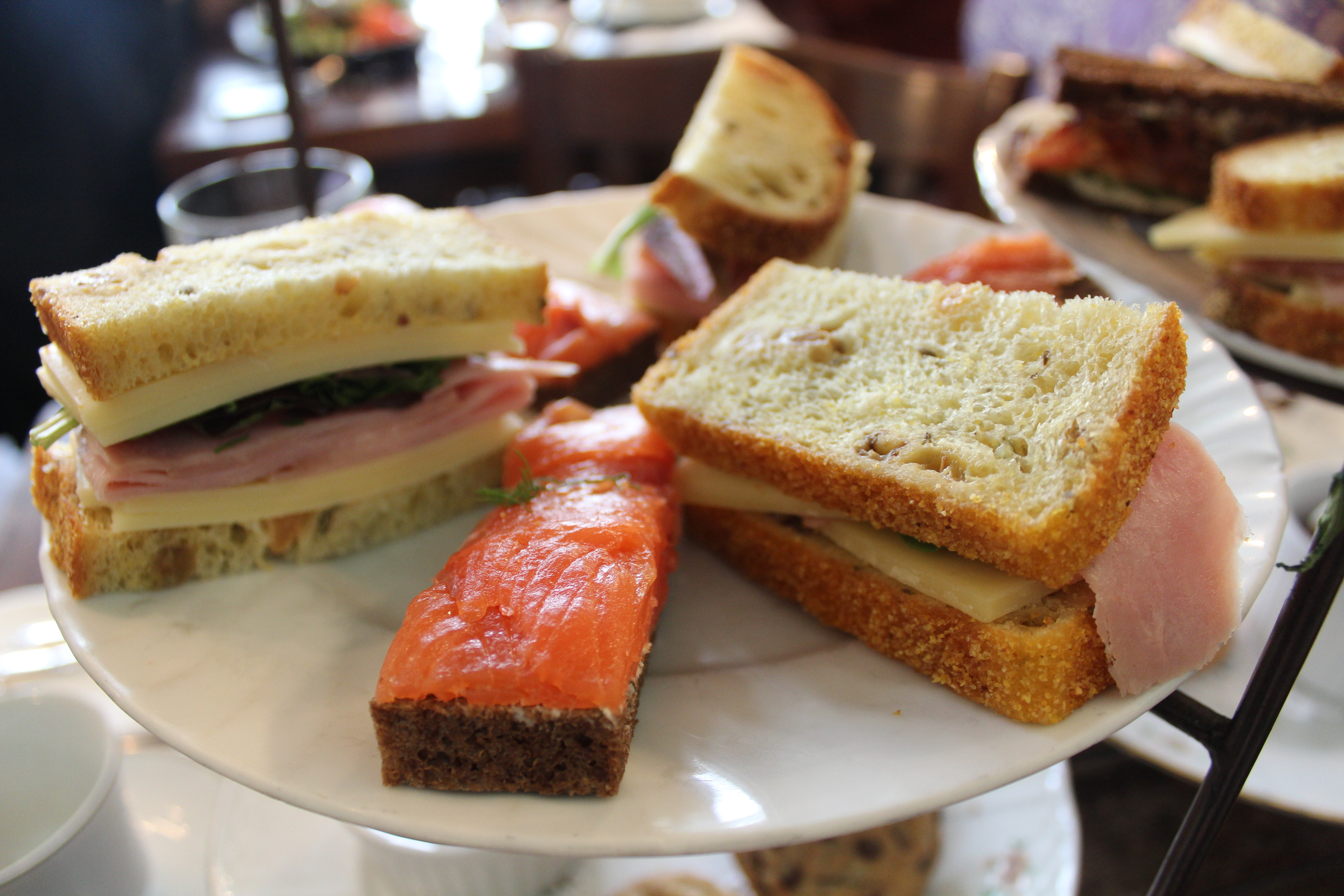 Tier two of the stand held the sandwiches. We decided to go with their black forest ham and smoked salmon sandwiches. There were three pieces of each sandwich, so we were able to try them both and then some. The smoked salmon sandwich was open-faced and was served with lemon-dill butter over pumpernickel bread. The salmon serving was very generous. I never felt like there was more bread than salmon. Very good!