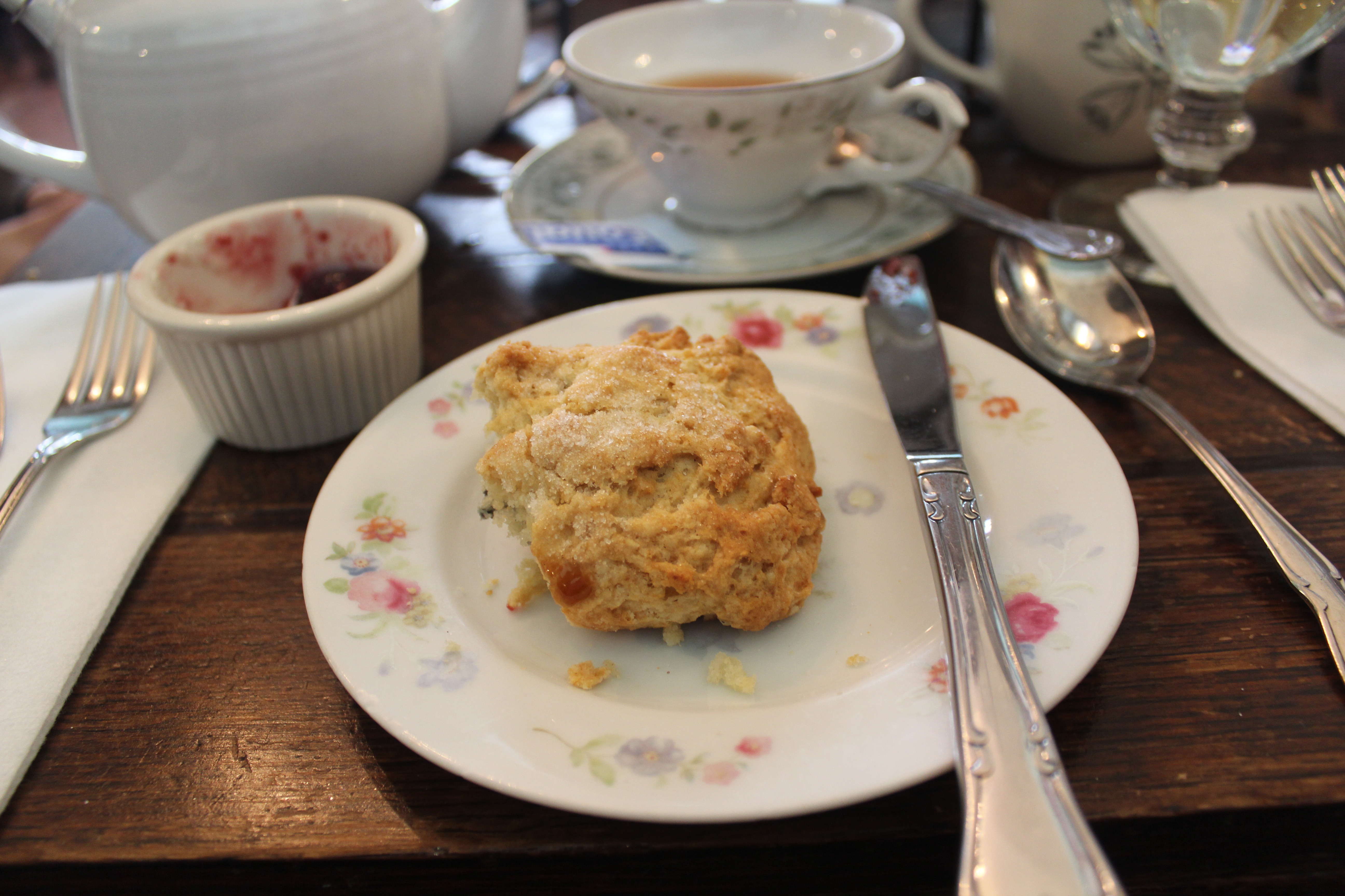 Next up is the blueberry coconut, which was my favorite of the scones that we ordered. I broke off a chunk to nibble on before my sister could snap a picture but the usual shape is triangular. There were coconut shreds and blueberries all over the scone. There was also a light sugar dusting on top, which I really liked. Paired with preserves and clotted cream, this scone was divine!