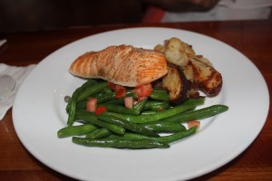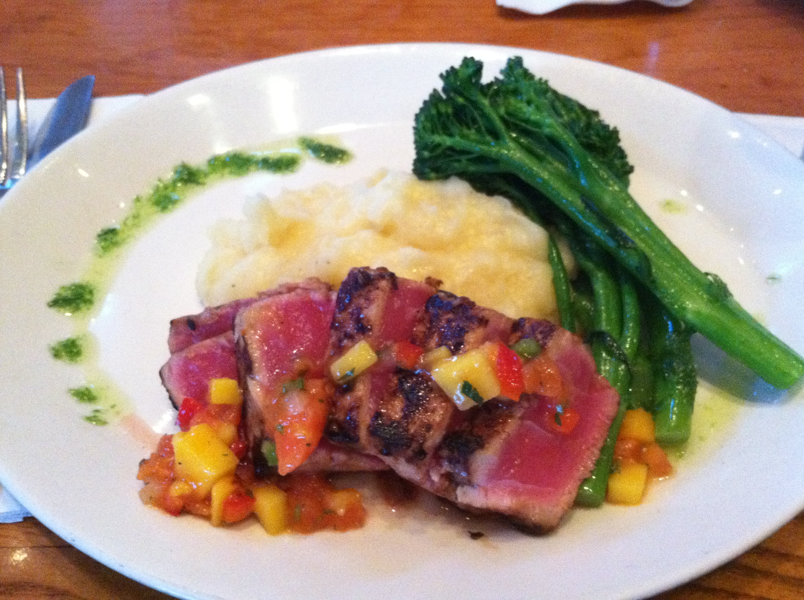 On one of our Universal days, we decided to have dinner inside our Disney resort – Caribbean Beach Resort. Caribbean Beach has two dining options – Old Port Royale food court and Shutters restaurant, which serves up Caribbean themed dishes. We didn’t have a reservation but was seated fairly quickly. Our waiter was, like all other Disney restaurants, very friendly and attentive. I decided to go with the Jerk-Crusted Yellow Fin Tuna, which features pan-seared tuna with a papaya-mango sauce. The tuna was delicious! I always say, the best way to eat tuna is either raw or seared and this dish was seared to perfection. The mashed potatoes were also very delicious.