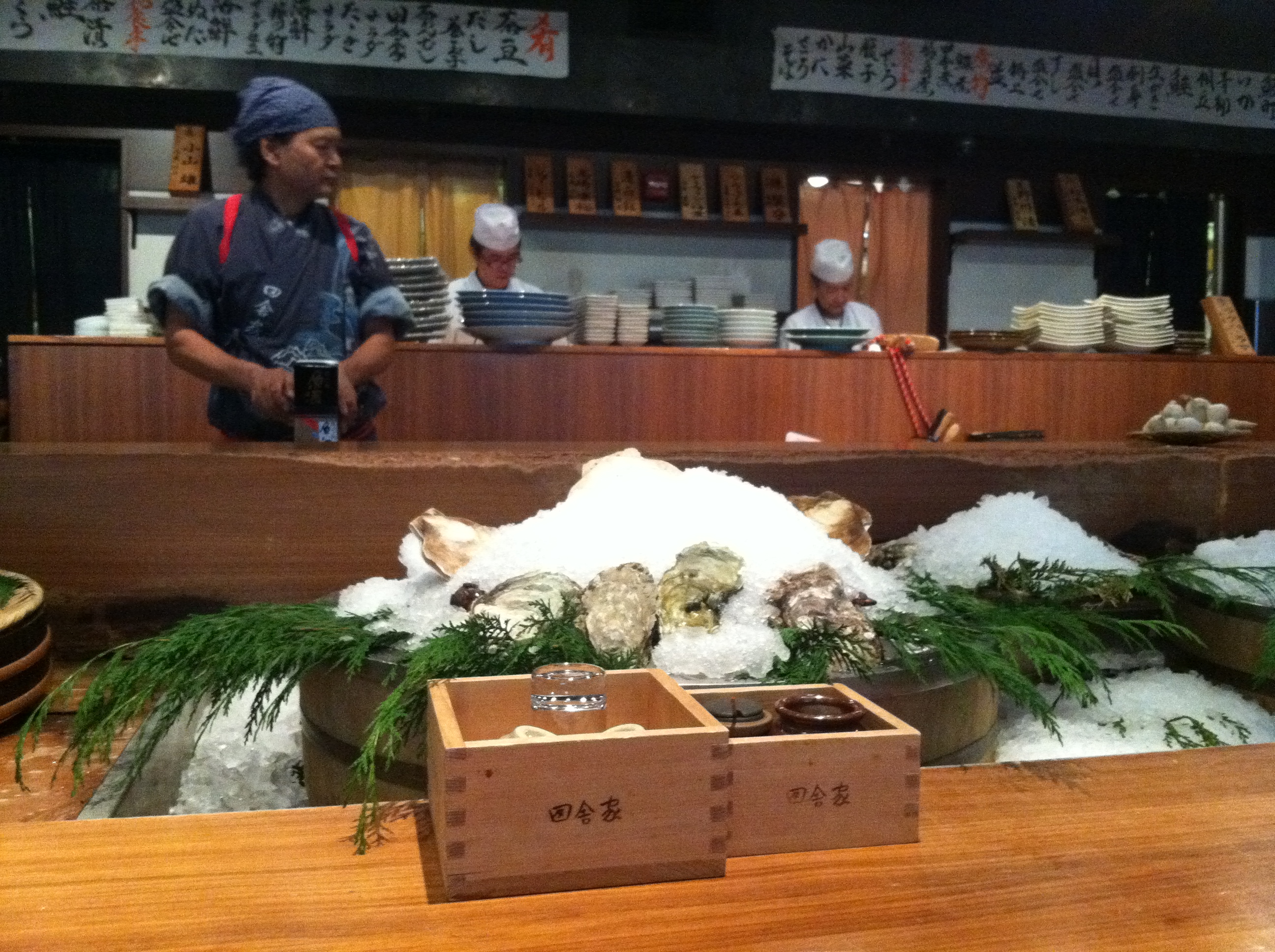 Inakaya is a Robata-yaki restaurant, which specializes in fresh and grilled small dishes. The bar wraps around the cooking area, where there are two sushi chefs and four chefs that serve different sections. The special thing about Inakaya is that if you sit by the bar, you get your food handed to you by your server via a wooden paddle.