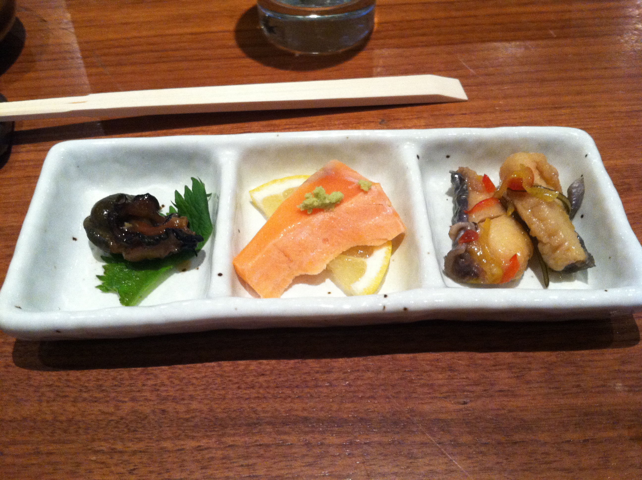 Our first course, or sakizuke, arrived around the same time as our hot hand towels. It was an assortment of three mini appetizers arranged by the chef. Our assortment included a type of cold grilled fish, a piece of salmon and a snail. Both the snail and the grilled fish were good but the salmon was the best. It was fresh and cooked just the right way.