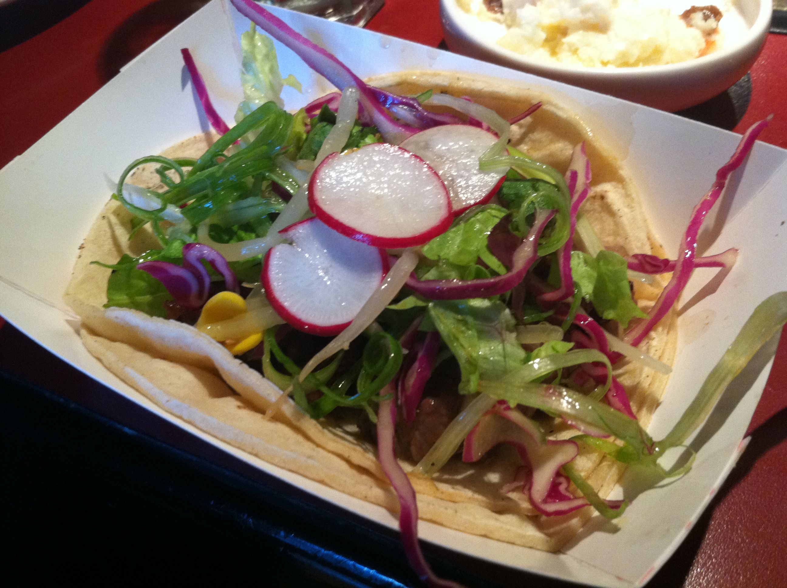 Since everyone raves about the tacos here, I opted to try their Short Rib taco ($4.00 each). The taco is stopped with short rib sautéed in their Korean BBQ sauce and served on two soft corn tortillas. It was absolutely delicious! After watching the show and seeing the Korean tacos served on the famous Koji Korean-Taco truck, I was really craving tacos and this one definitely hit the spot. I can see why some of the other tables only ordered tacos and nothing else. The short rib was so tender and flavorful that I didn’t even need to add hot sauce (but it did taste extra good with some hot sauce). I can definitely see myself coming back just to eat the tacos.