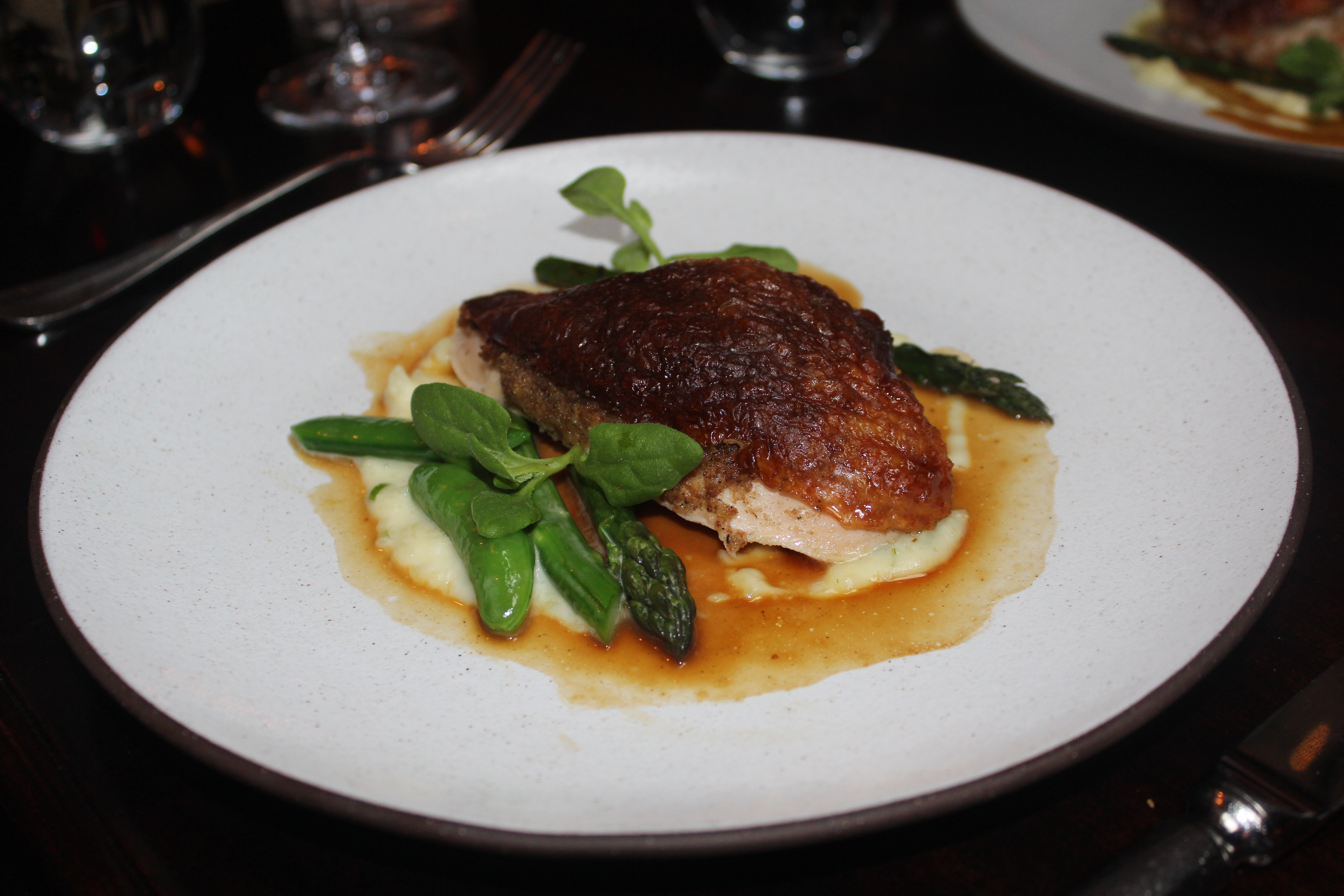 As we were munching on our second loaf of bread and chatting, our waitress brought over my Roasted Chicken ($78 for two). I had managed to swindle my mother into sharing the chicken with me. They present the whole chicken to you tableside first. They then take it back for around 15 minutes as they cut up the white meat and cook the dark meat with mushrooms.