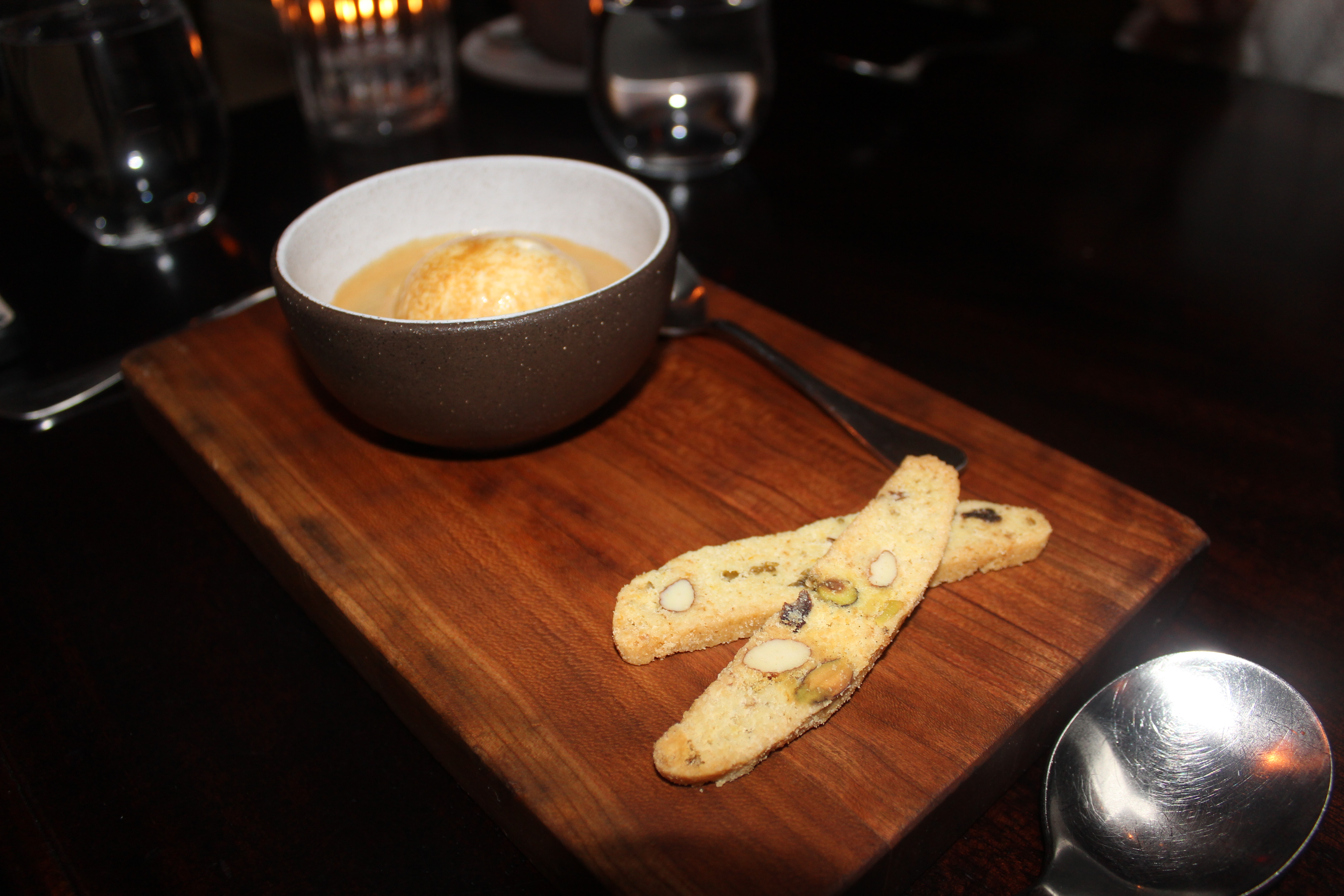 I opted for an Affogato ($8.00), which is basically a scoop of vanilla ice cream that is topped with a shot of hot espresso. Our waiter presented the combination to me separately and then helped me pour the espresso into the ice cream. The bowl was really cute and came with two tiny biscotti pieces. I had started getting really sleepy during our meal because I had been up super early for graduation services that day but the espresso kept me up far into the night.