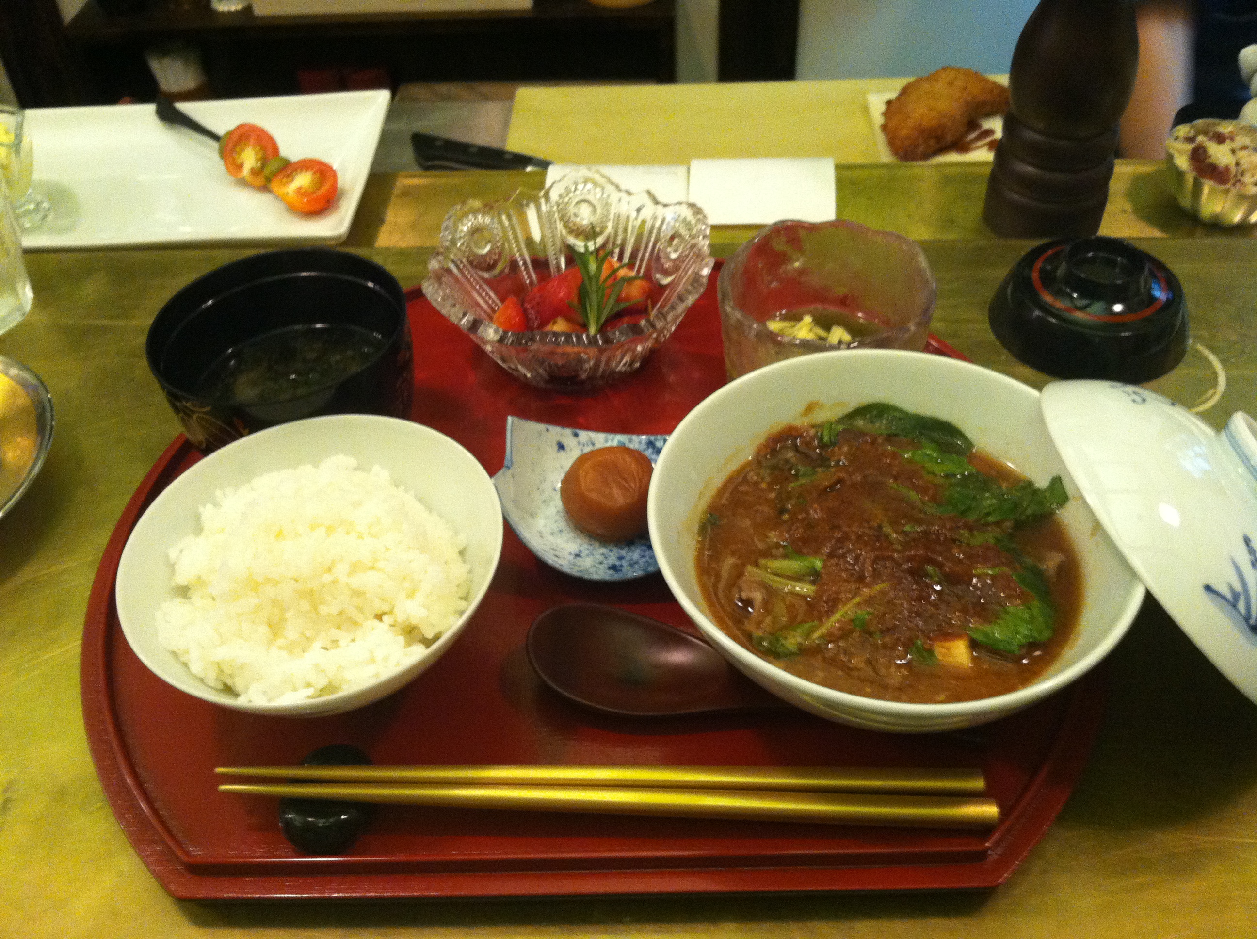The Boyfriend decided on the Shokudou Lunch Set ($13.00), which features Japanese tapas dishes with rice and miso soup. The dishes, starting from left, are – miso soup, strawberries in a balsamic glaze, vinegar and ginger with seaweed, and a sour plum. The big dish was sliced beef, tofu and egg in a thin broth. The broth was extremely delicious – the sliced beef was extremely tender and the entire mixture gave a lot of flavor to the broth. The set was just enough to fill him up but not so much that he was too full.
