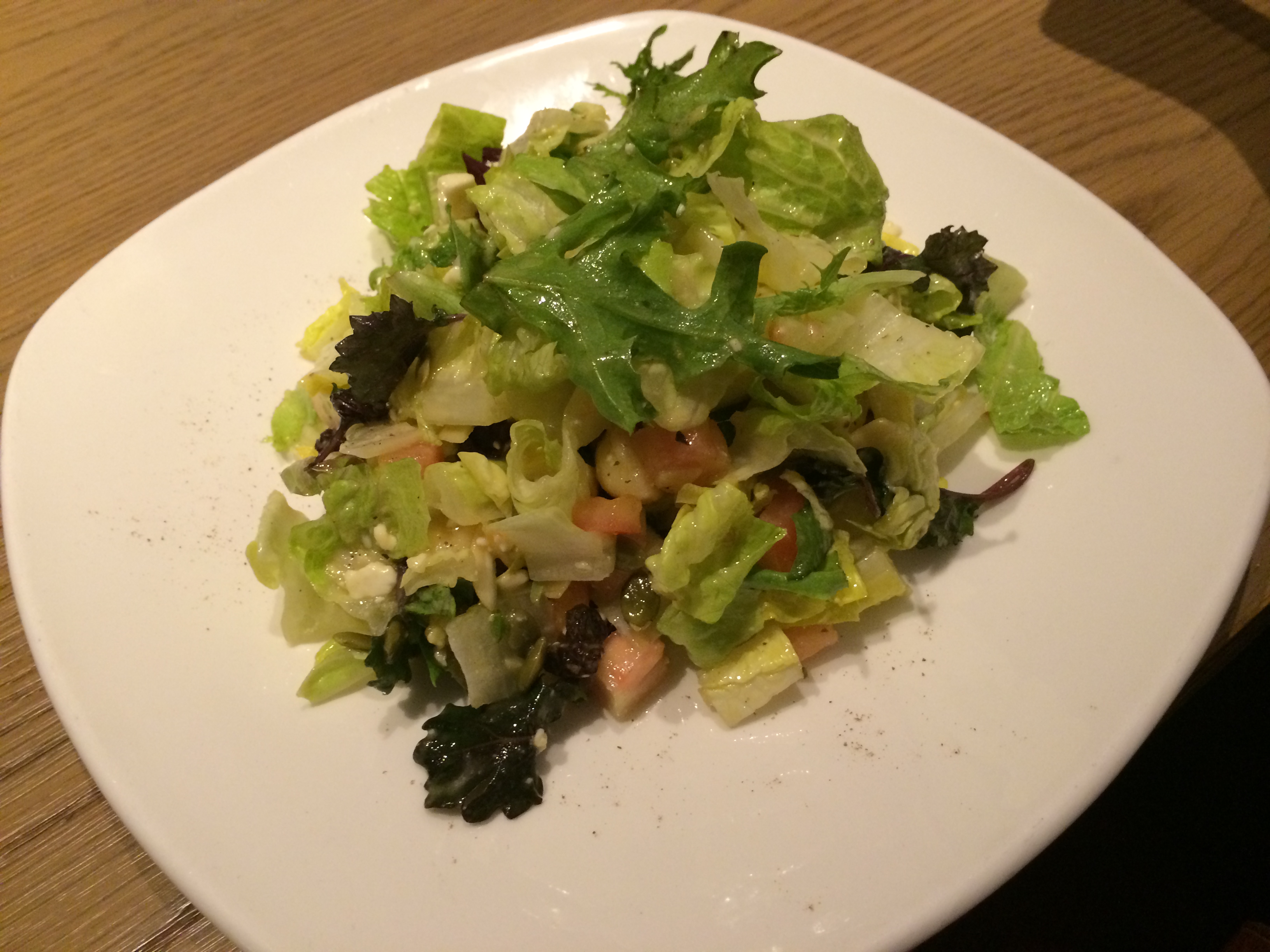 Since we needed some veggies, we opted for the Bungalow Salad ($8.00), which features romaine lettuce tossed with toasted almonds and macadamia nuts, feta cheese, sun-dried blueberries and a meyer lemon vinaigrette. The vinaigrette was very light and fresh and paired very well with the other ingredients. We even used the bread to soak it up after we finished the veggies.