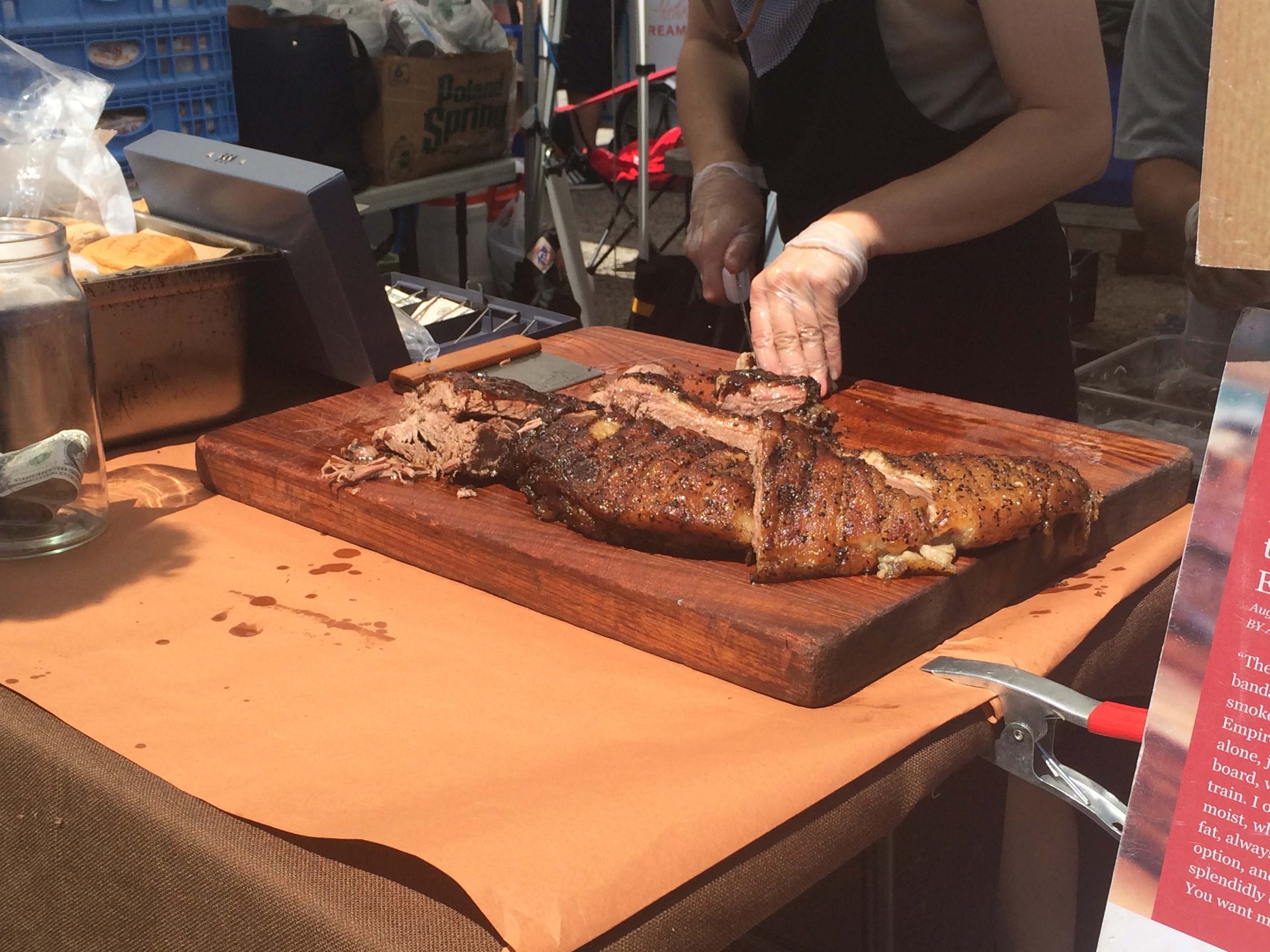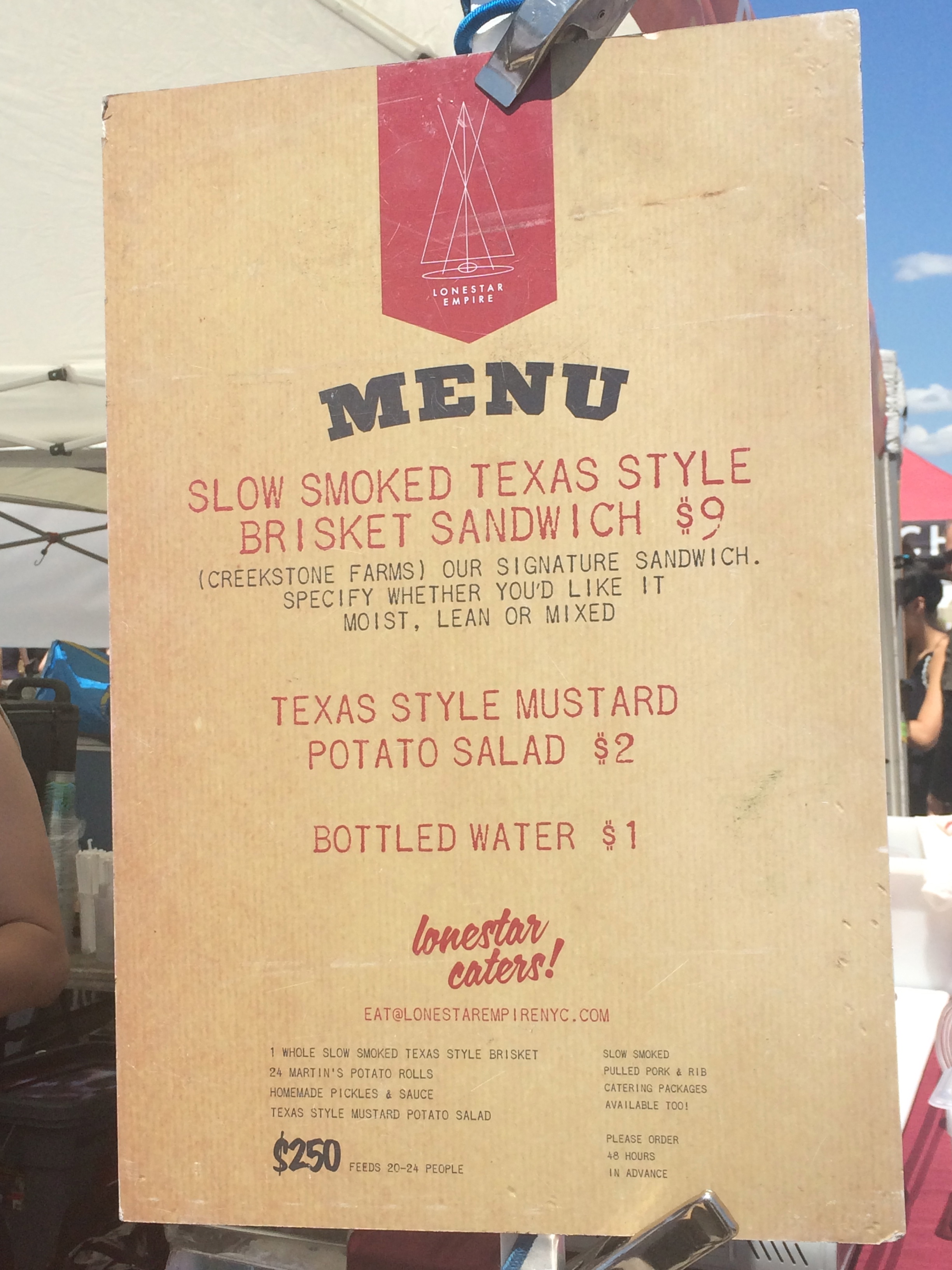 After we polished off our ramen burgers, we walked around a bit more to see all the options. We walked by Lonestar Empire just as they pulled out a beautiful piece of brisket. The smell and amazing appearance hooked us and we ordered their Slow-Smoked Texas style Brisket Sandwich ($9.00). You get your choice of moist, lean or a mixture of the two so we went for the moist. They have a few toppings you can add on to your taste but we decided to do it plain. The brisket was so soft and tender! It was very well flavored. We’re both not big brisket fans but this one definitely changed our minds!
