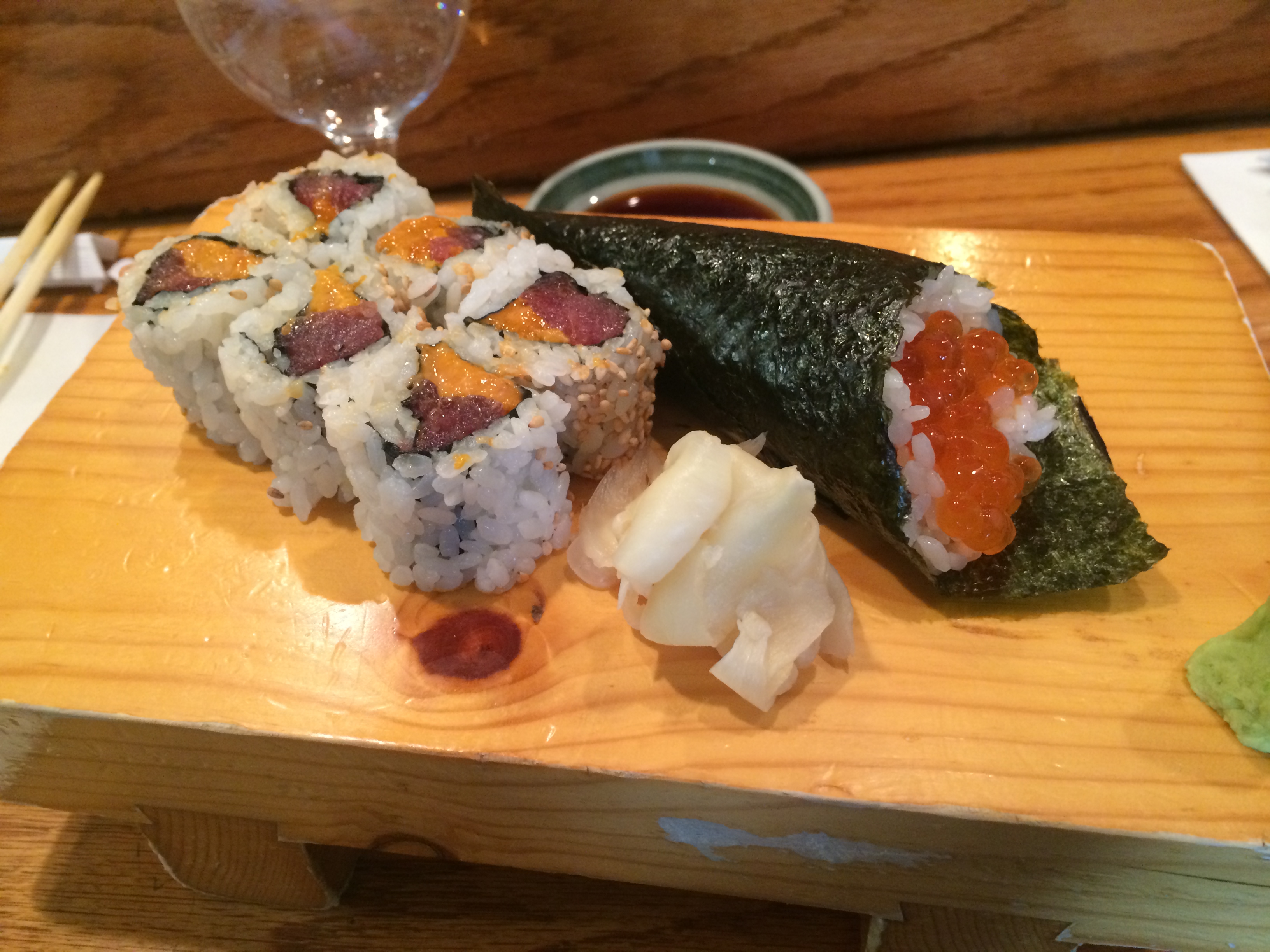 We opted to start off with a Tuna and Uni Roll ($8.00). The Boyfriend also ordered an Ikura (salmon roe) hand roll ($6.00). Both rolls were very fresh and nicely done. I thoroughly enjoyed the Uni. I always want to order Uni but I’m never sure if it’s going to be fresh. The Uni at Marumi is definitely fresh and brightly colored. I could eat four of these rolls!!