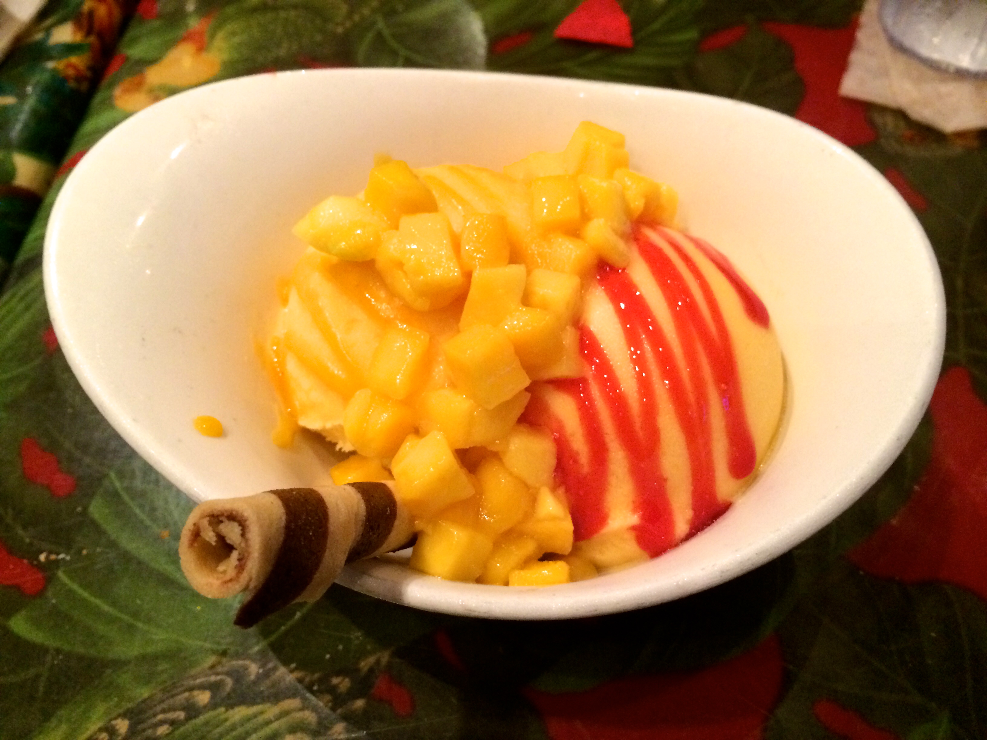 For my dessert, I had Maya’s Mango Sorbet, which is served with fresh cubed mango, raspberry sauce and a chocolate filled wafer. As with the other Disney restaurants, the dessert portion size was huge! They give you two huge scoops of mango sorbet and in my opinion, it’s definitely more than enough for two to share – let alone just me! The sorbet was refreshing and just right for a hot, humid Florida night.