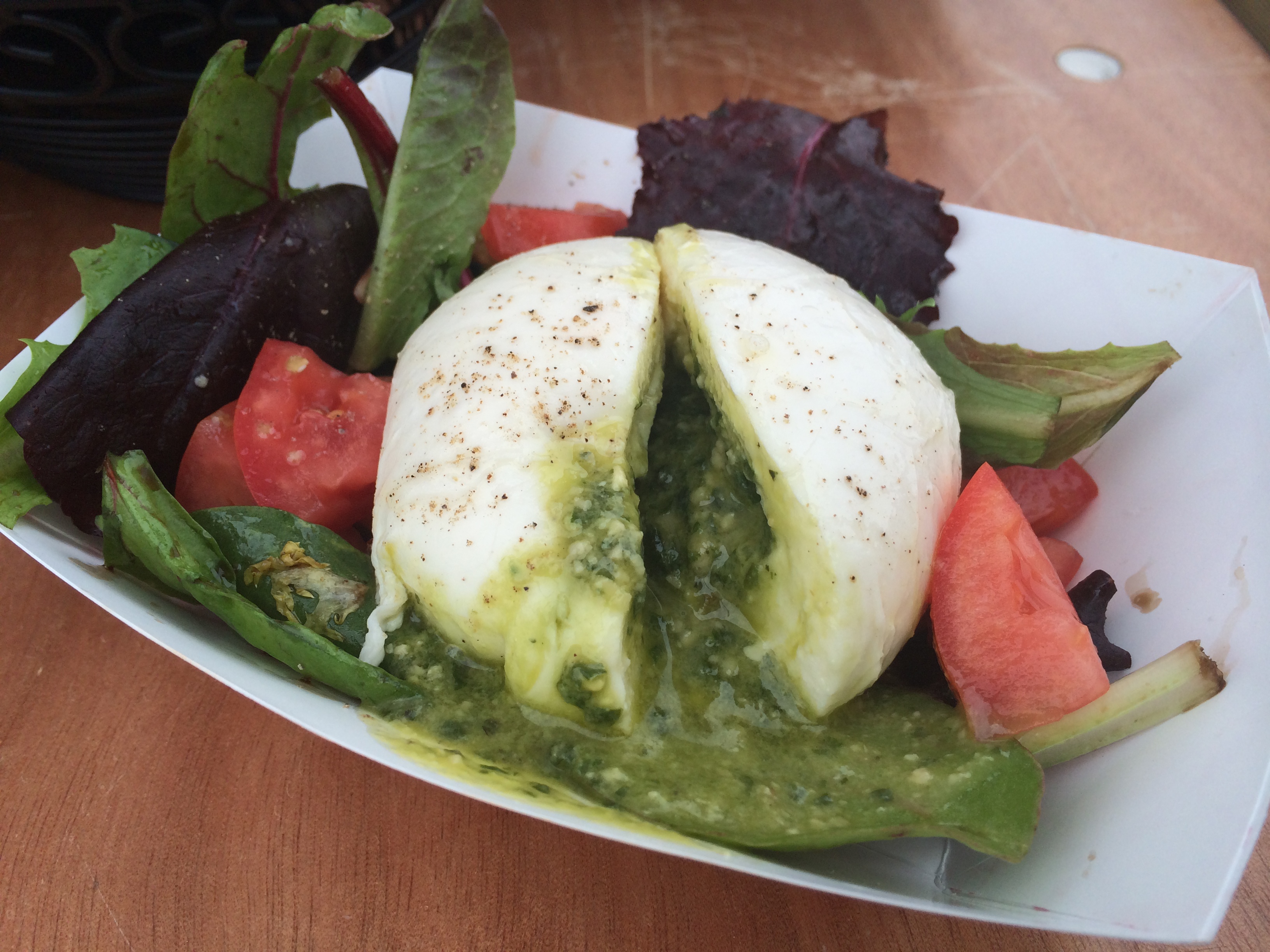 Our second stop was Big Mozz, which serves up freshly made mozzarella that’s craft on site! You can even stand by and watch as they stretch and roll the mozzarella balls! We opted for the Mozzarella Bomb ($7.00), a ball of mozzarella cheese injected with pesto and served over greens. This was one of my favorites of the day – the pesto was very flavorful and tasted amazing when mixed with the super fresh mozzarella and greens. I highly recommend a stop at Big Mozz!