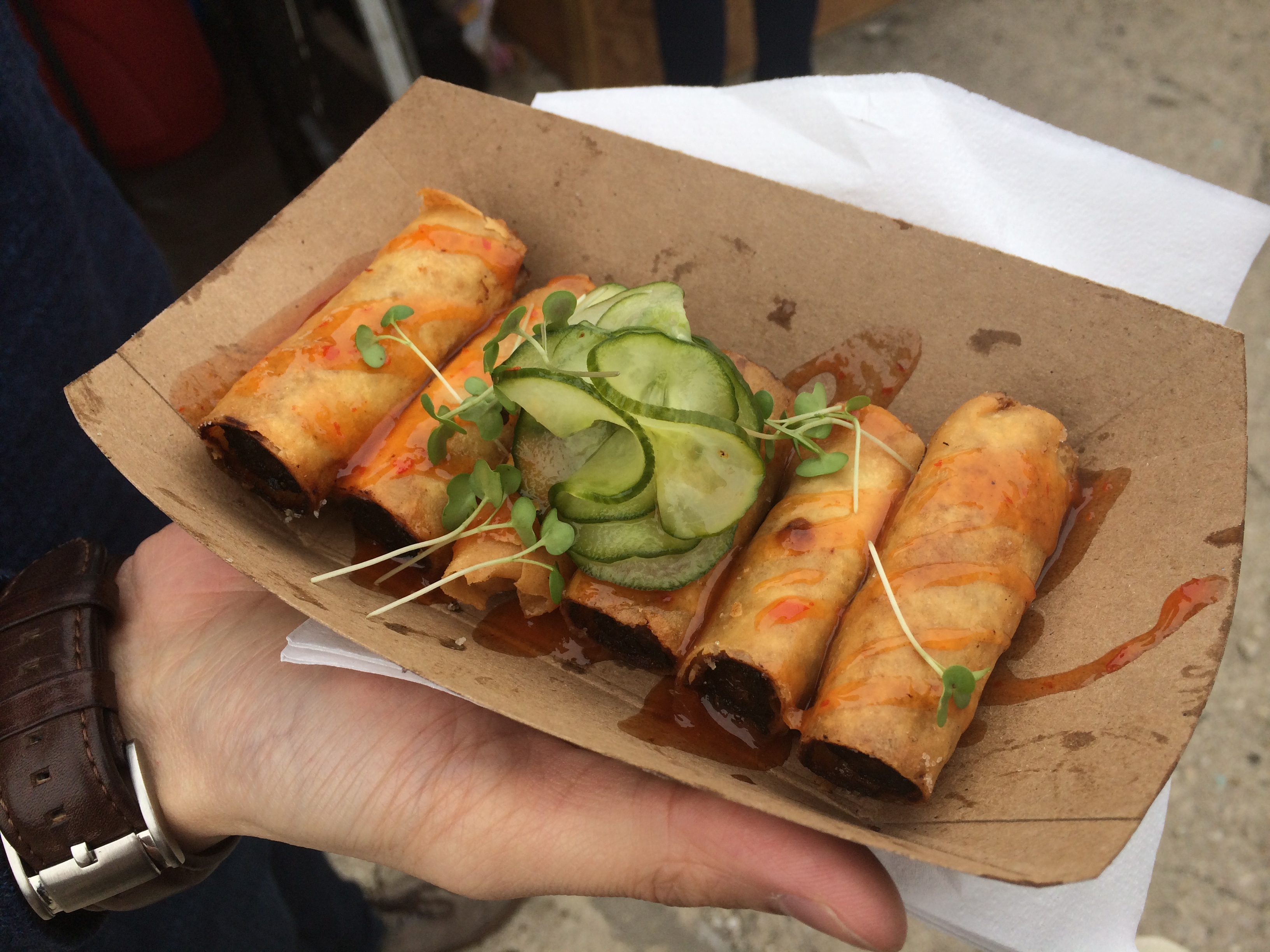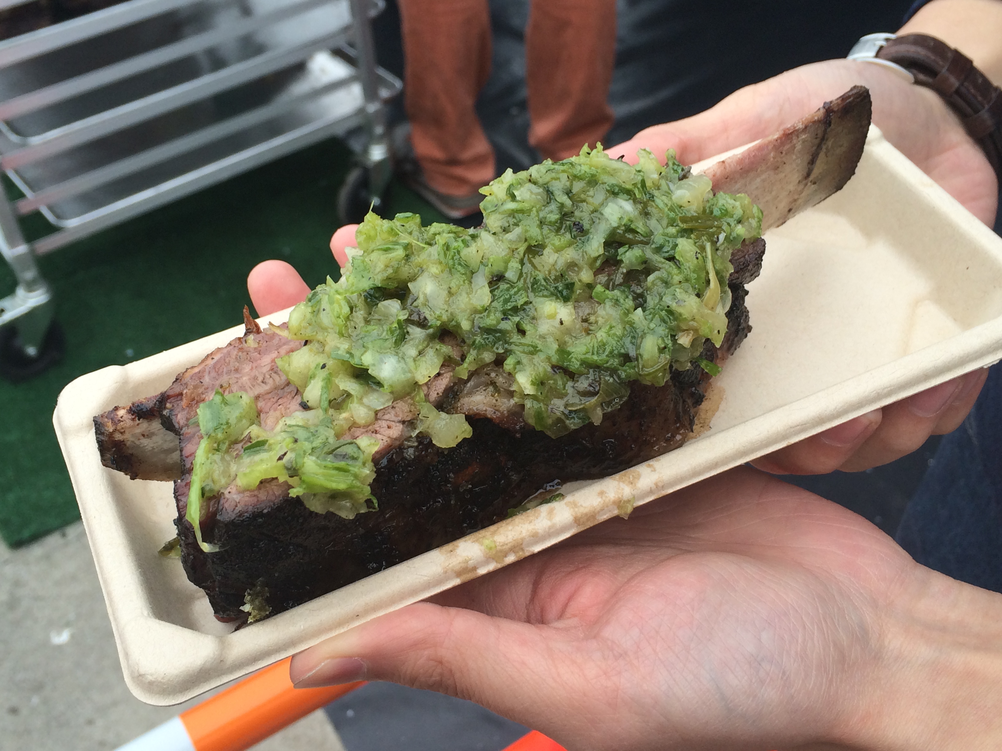 Our fourth stop was Carnal – we had not planned to stop but the smell got to us. We walked a few feet within the stand and could already smell the delicious grill! Today, Carnal was serving up Beef Short Ribs ($13.00) topped with bone marrow, spring onion and black pepper. The price tag is a bit steep but the ribs are divine! They’re very moist and tender – basically falling off the bone with each bite. The bone marrow and spring onion topping is so flavorful and buttery. It’s a messy dish but it’s a damn good one.