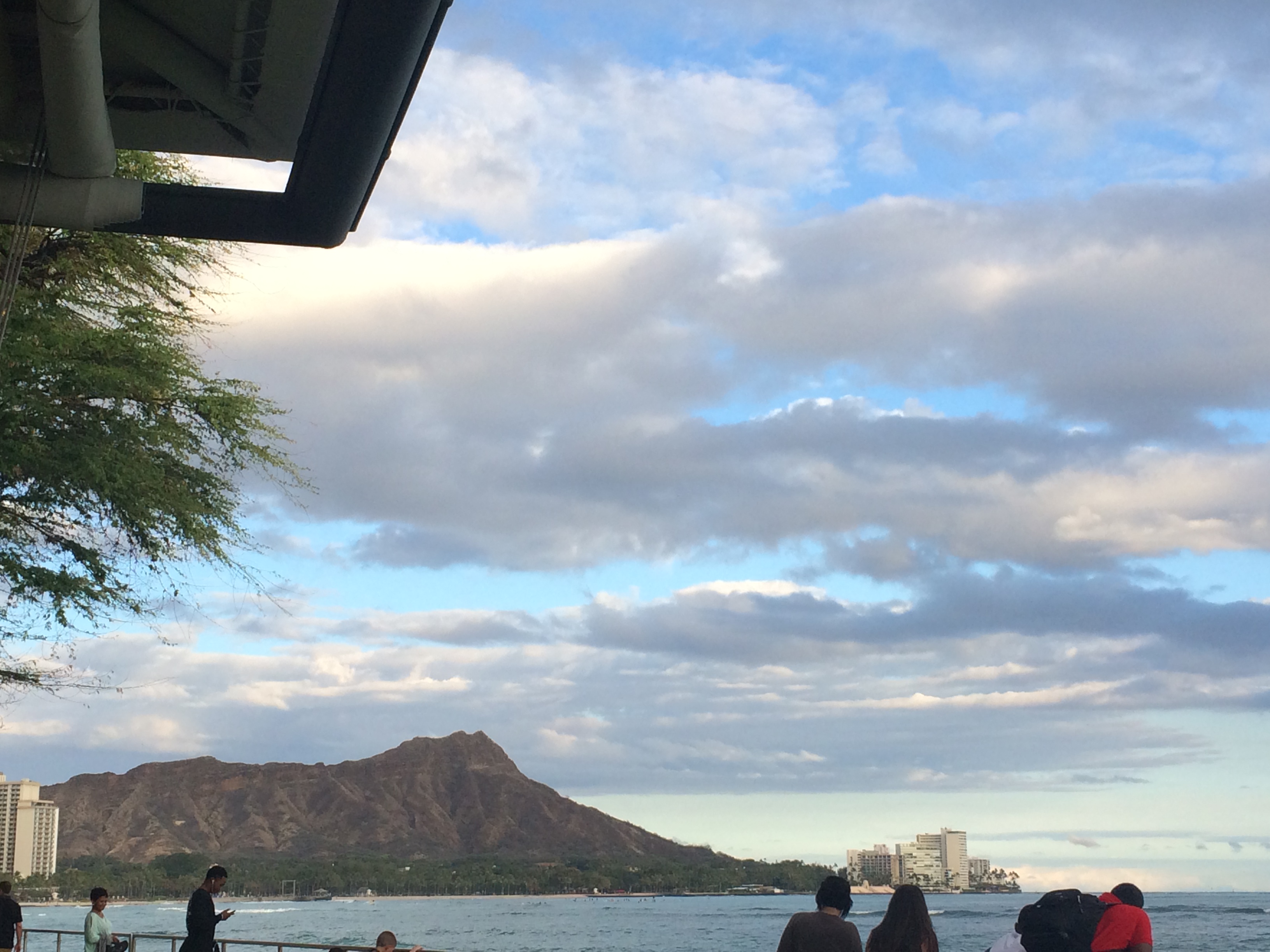 Our waiter was super nice and helped us take loads of pictures against the backdrop of Diamond Head. It was such an amazing view – Diamond Head and Waikiki Beach on one end and the sunset on the other. There was a light breeze from being so close to the ocean – everything just seemed perfect.