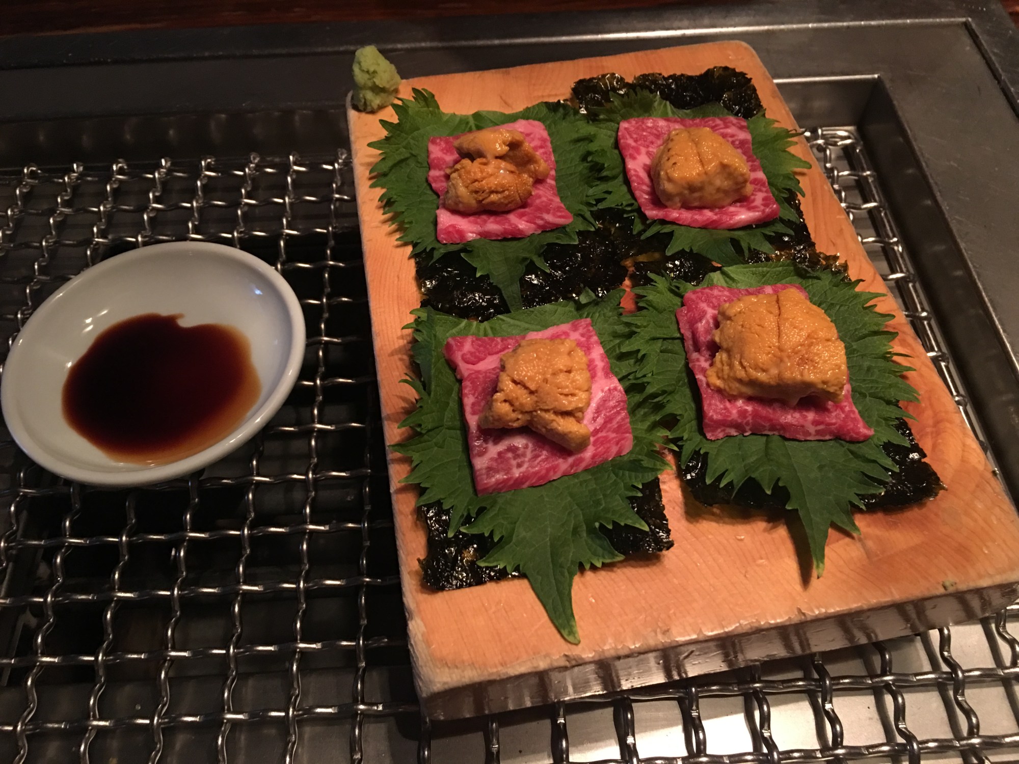 We opted to start with a few shared appetizers and then move onto the yakiniku. Our first appetizer to arrive was their Instagram-famous Niku-Uni ($26), which features raw chuck flap topped with sea urchin and served on top of a shiso leaf and seaweed. I really enjoyed each bite (spoiler, I had 2). The uni was really fresh and creamy, and all the flavors meshed really well together.