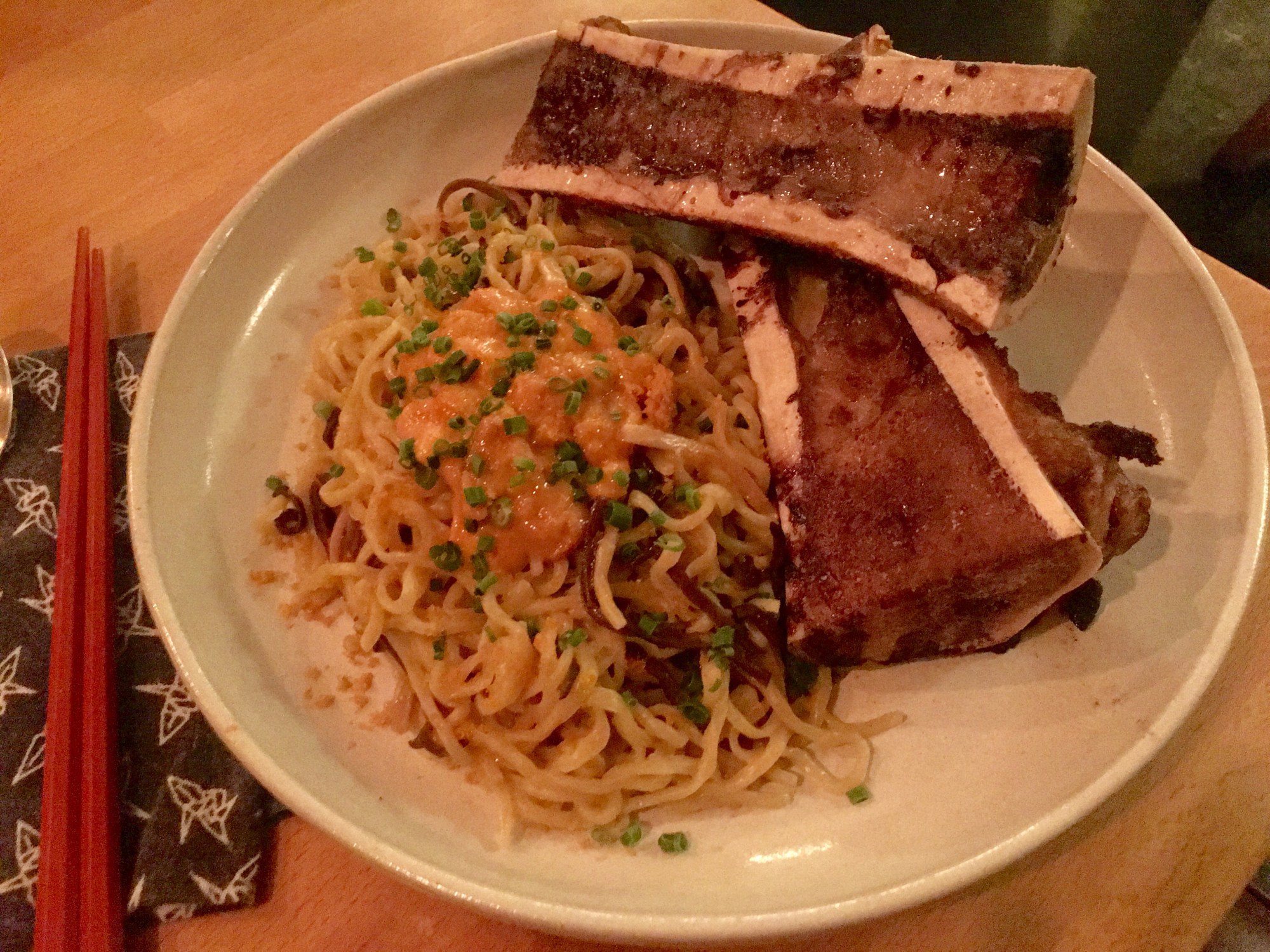 Uni Mazemen – temomi ramen noodle, sea urchin, bone marrow, and bottarga ($28)