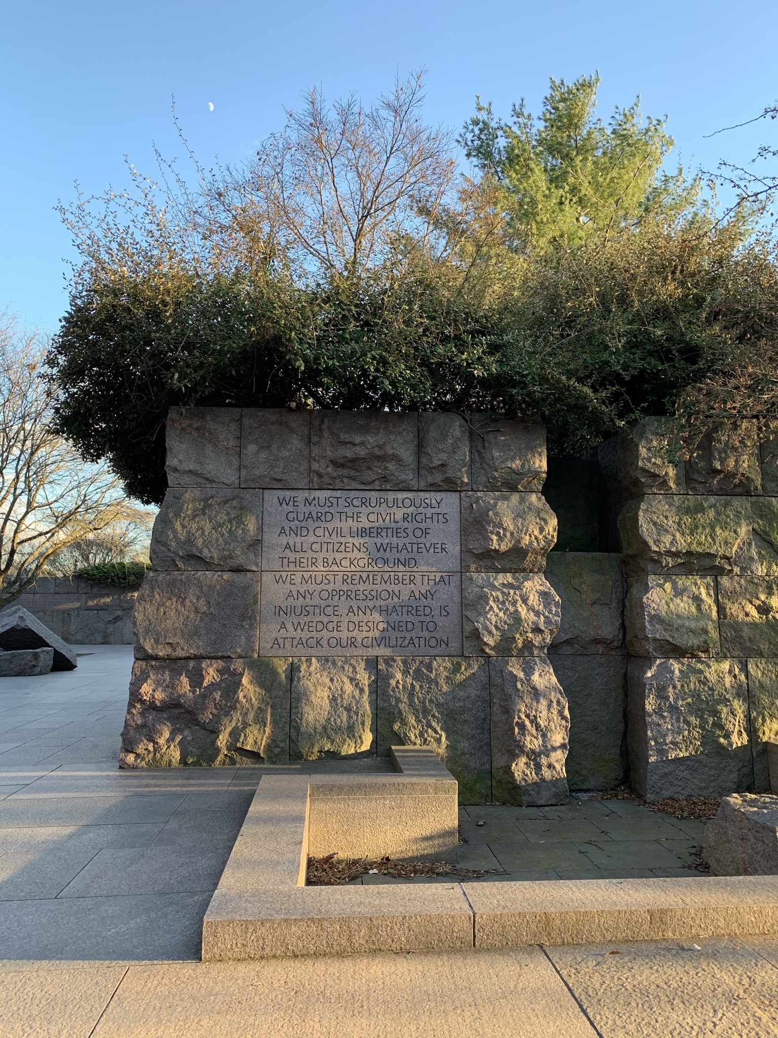 For example, the Franklin Delano Roosevelt Memorial. The Memorial is open 24 hours a day and covers FDR’s four terms in office, chronicled through quotes carved in stone and fascinating bronze artwork.