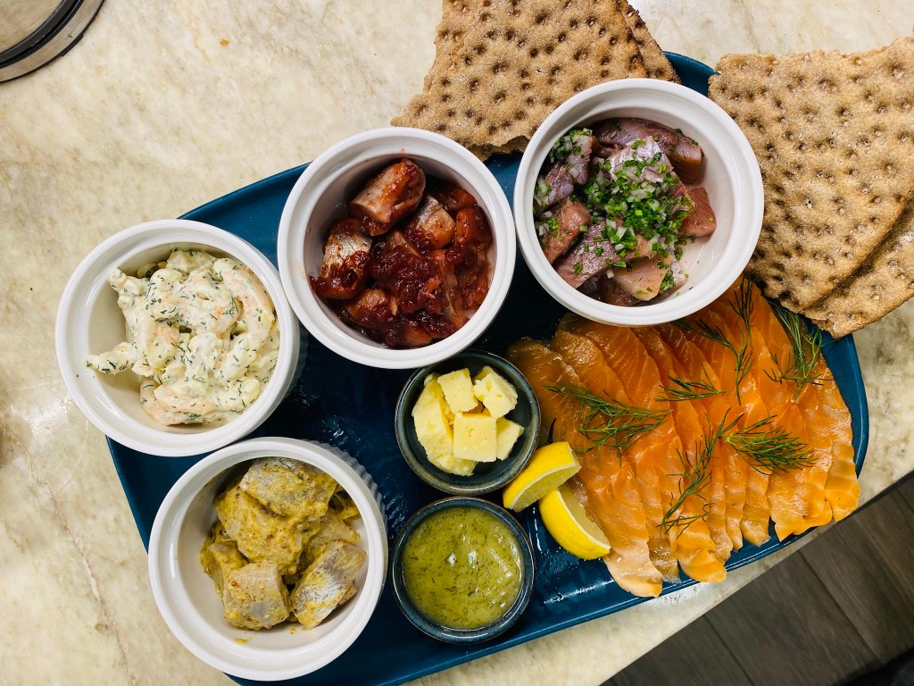 The Smörgåsbord for Two features 3 types of Herring (Matjes, Mustard, and Lingonberry), Gravlax & Hovmästar Sauce, Shrimp Skagen, Swedish Cheese, Potatoes, and Crispbread. The Gravlax was just as good as any we had in Stockholm and I absolutely adored the Mustard and Lingonberry Herring. Just look at this beautiful picnic!