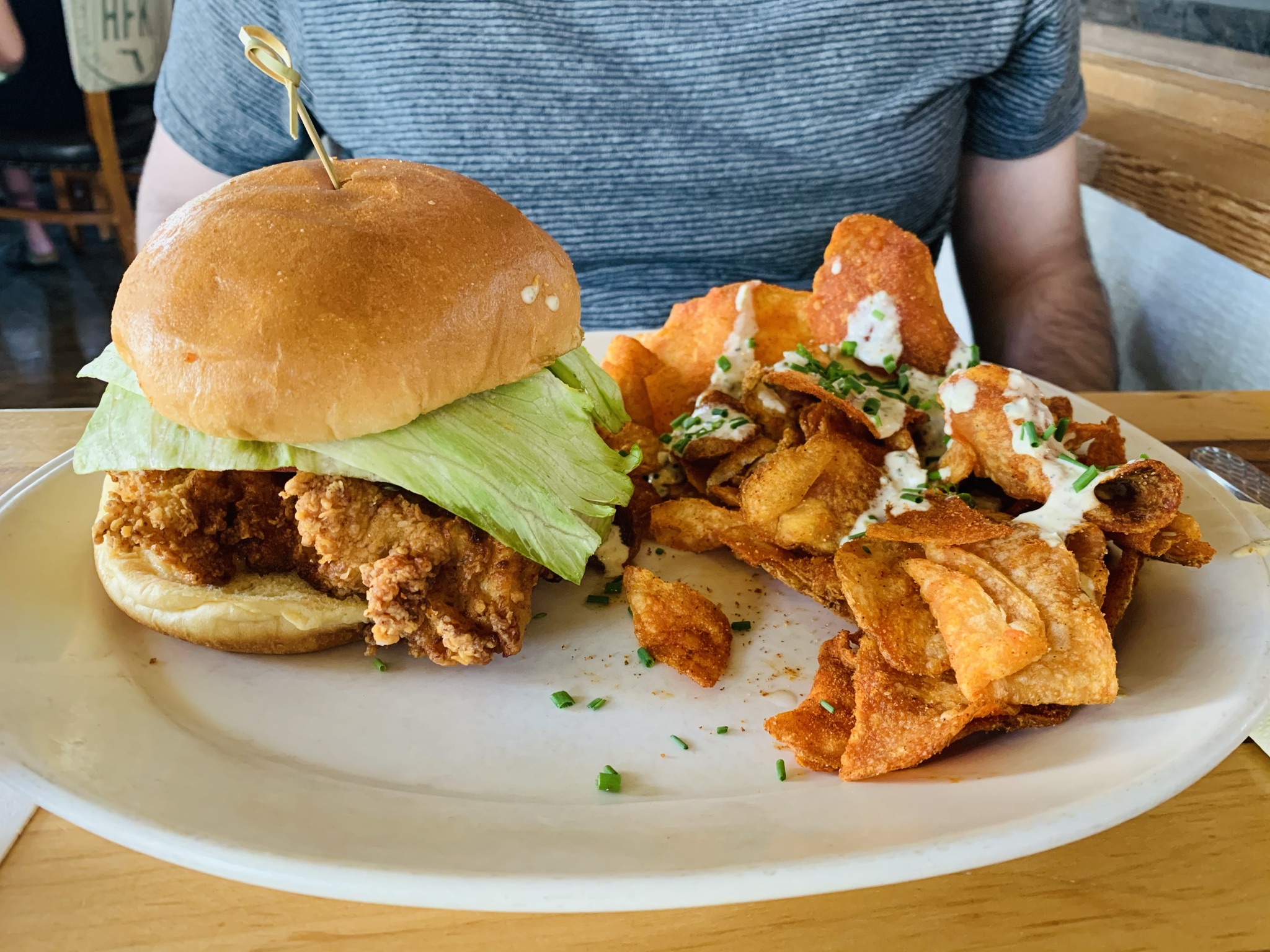 For our mains, we both ordered the Fried Chicken Sandwich – Buttermilk-brined for 24 hours and hand-battered fried chicken, dressed with hot sauce, aioli, iceberg lettuce, tomato, and butter pickles ($18). Each sandwich is served with house-made barbecue chips drizzled with icebox dressing. I opted to substitute my chips with their Momma’s Mac & Cheese. The chicken was moist, juicy, and perfectly crispy on the outside. It’s a large, large portion though, so come hungry!