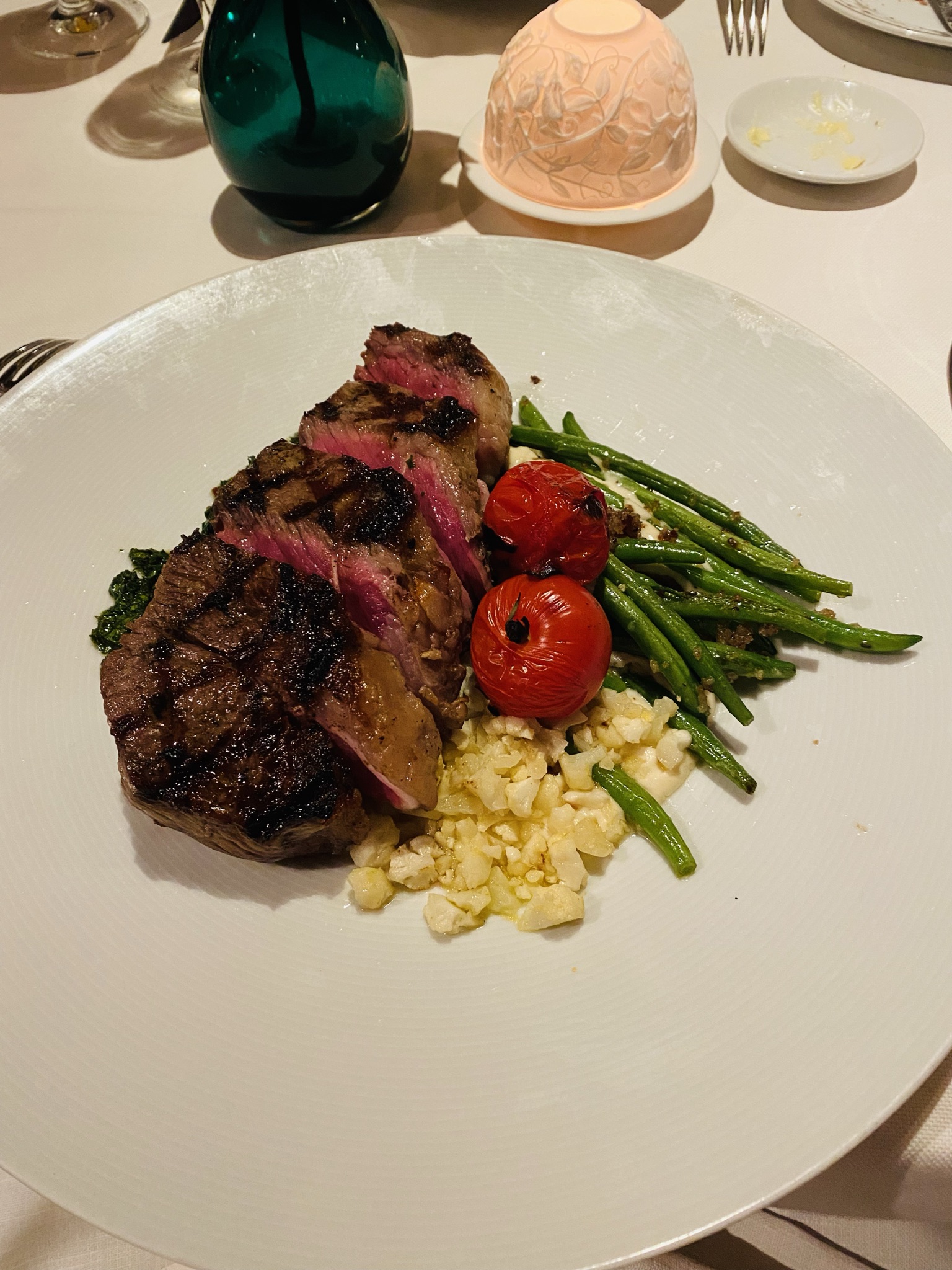 X splurged for his main dish, choosing the Tagliata (supplement of $12), featuring a 14 oz. New York strip, cauliflower, pole bean, charred tomato, and salsa verde. The steak was great – but the cauliflower puree was my favorite part. Sweet and slightly salty, it was the perfect pairing with the steak.