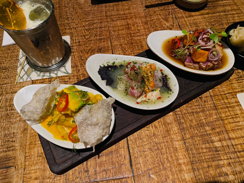 And lastly, perhaps our favorite meal of our entire trip (minus Leo, of course), was at Osk Peru. Japanese food is my absolute favorite cuisine – and X loves Peruvian food. A Peruvian-Japanese fusion restaurant seemed like a no-brainer for us. We both thought that the menu at Osk Peru was the most exciting and appealing to our palettes. To start, we had a delicious ceviche sampler with three styles of ceviche – Kiro, Kunsei, and Wasabi. We liked all three, but definitely had differing opinions on which was the best. I favored the more Japanese-style one, while X liked the more Peruvian-style one. No surprise there! My favorite dish was the Kuroi Ramen, with charred seafood and squid ink ramen in a creamy curry sauce. This was such an inventive and fusion-style dish and it tasted amazing! X’s favorite was the Niku Tartar, featuring tenderloin tartare, foie gras crust, quail egg, and nikkei anticucho sauce. The tartare is assembled tableside, with your waiter torching the foie gras crust as you watch the fireworks. And of course, as we were visiting during the Election, there was no alcohol served. This was absolutely no problem as Osk Peru has the most delicious selection of non-alcoholic mocktails. Make sure you try the Midori & White, featuring matcha, lychee, and soursop.