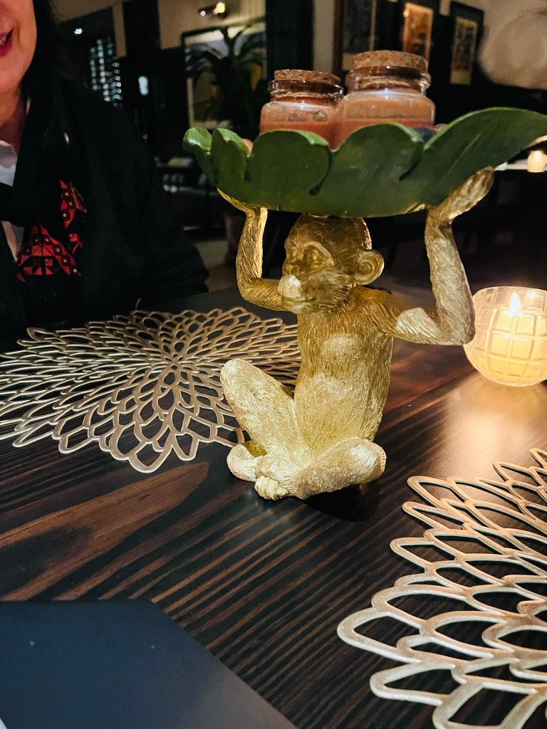 Our first course was a drink made from cocoa and achiote, a paprika-like spice, and served on top of coffee beans in this cute little monkey stand.