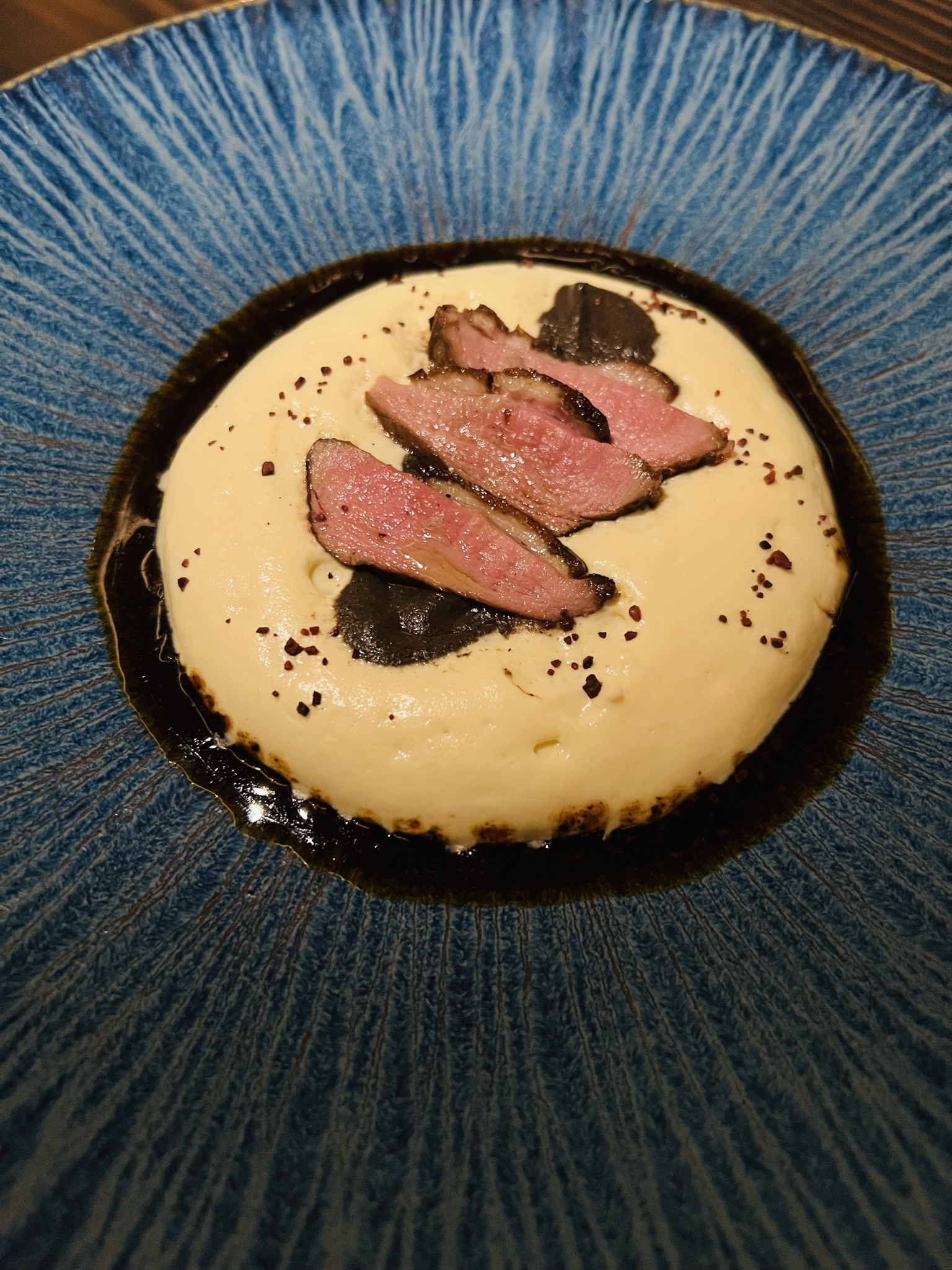 Roasted Duck Breast with a cocoa nibs and coffee oil sauce, served over a potato puree