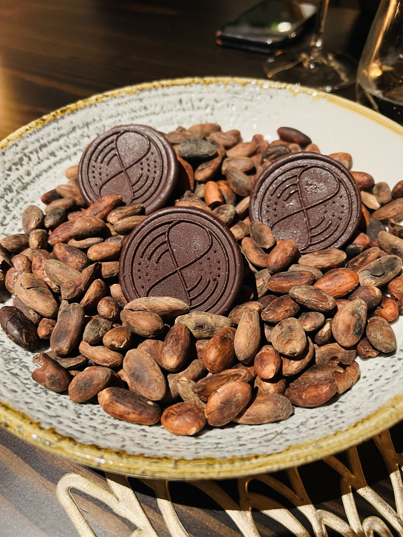 Dark Chocolate Medallions with their logo, served on cocoa beans