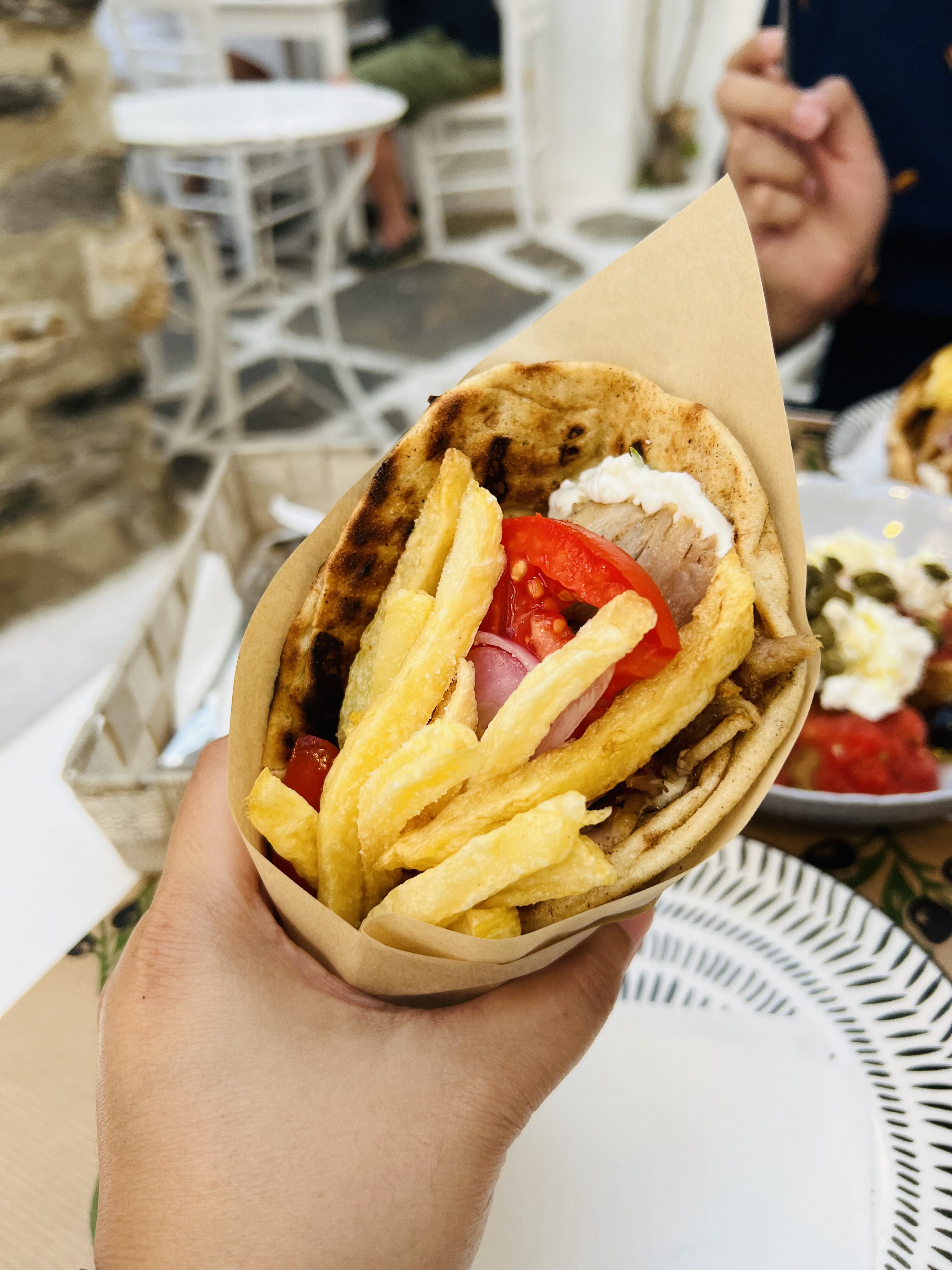 For a quick and satisfying meal, check out Souvlaki Kargas. It’s a simple, no frills souvlaki spot that’s cheap and tasty. We actually ended up having an early dinner here after a long boat trip as well as lunch on our last day. Both times, we had the Pork Gyro in Pita, which is packed with ingredients and so flavorful. If you’re feeling extra hungry, try the Dakos Salad, with rusk, crushed tomatoes, local soft cheese, and capers.