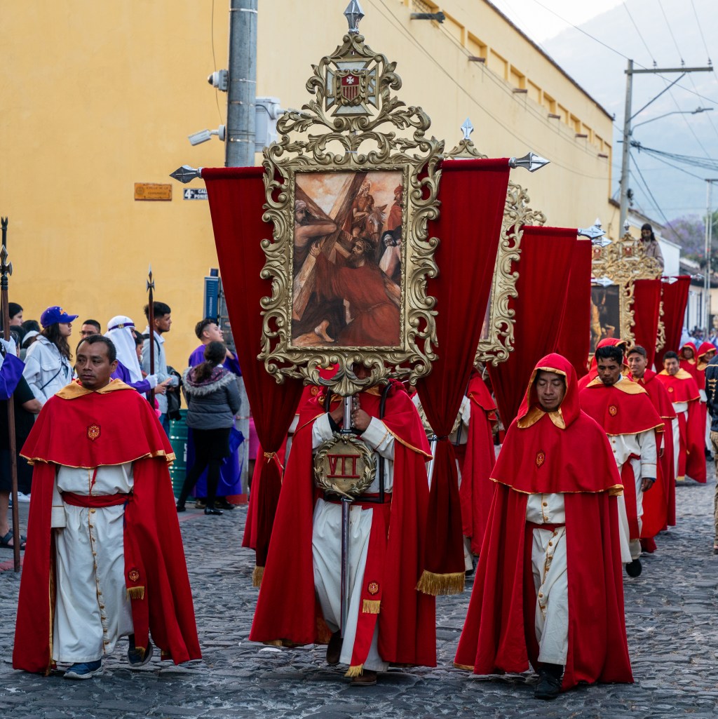 On Good Friday, the early morning processions are led by Roman “soldiers” dressed in red and gold, followed by cucuruchos dressed in purple with the floats. After 3pm, the cucuruchos change into black robes, to signify mourning. The evening processions on Good Friday are considered the most intense, with many of the floats depicting graphic images of Jesus dying on the cross.