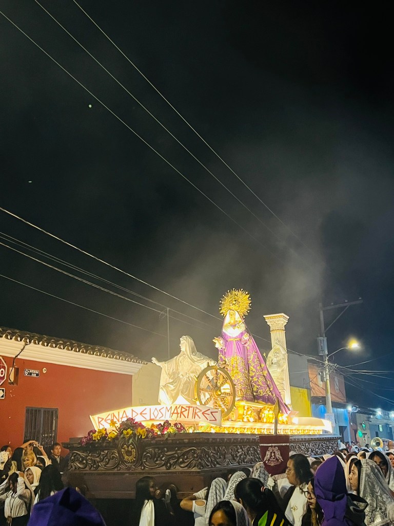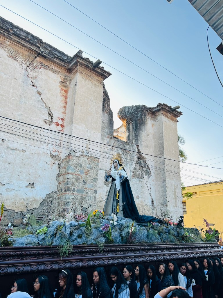 During Semana Santa, andas, or “floats” with statues of Jesus Christ and the Virgin Mary are carried through the cobblestoned streets of Antigua. Each float with Jesus is carried by cucuruchos or “bearers”. The larger floats that I saw during Semana Santa required over 100 cucuruchos to carry, dressed in purple robes with white waistbands. The floats with the Virgin Mary are often carried by women dressed in all black. Weighing at up to 7,000 pounds each, the wooden floats sway from side-to-side with each step the carriers take.