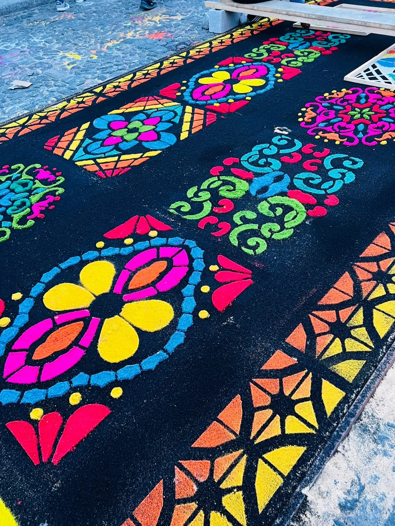 Aside from the processions, the streets of Antigua are also decorated and lined with beautiful alfombras, or carpets. The carpets are made by the families that live in Antigua and they’re often planned months in advance. The carpets are typically made with vibrantly colored sawdust, but I also saw one made with pistachio shells as well as other plants, flowers, and vegetables. The carpets are made just a few hours before the processions are set to make their way down the streets and are immediately cleaned up once the processions pass. I highly recommend visiting during the early morning hours to catch the beautiful carpets in full glory before the processions pass by.