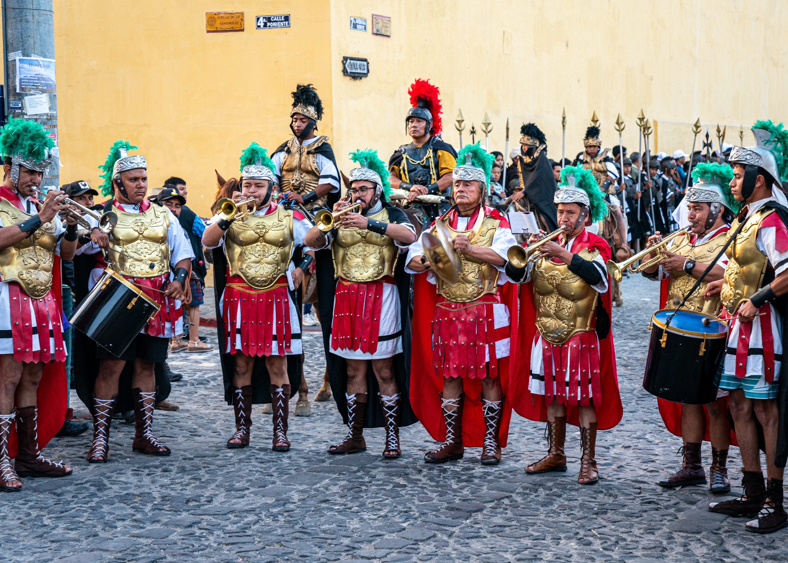 On Good Friday, the early morning processions are led by Roman “soldiers” dressed in red and gold, followed by cucuruchos dressed in purple with the floats. After 3pm, the cucuruchos change into black robes, to signify mourning. The evening processions on Good Friday are considered the most intense, with many of the floats depicting graphic images of Jesus dying on the cross.