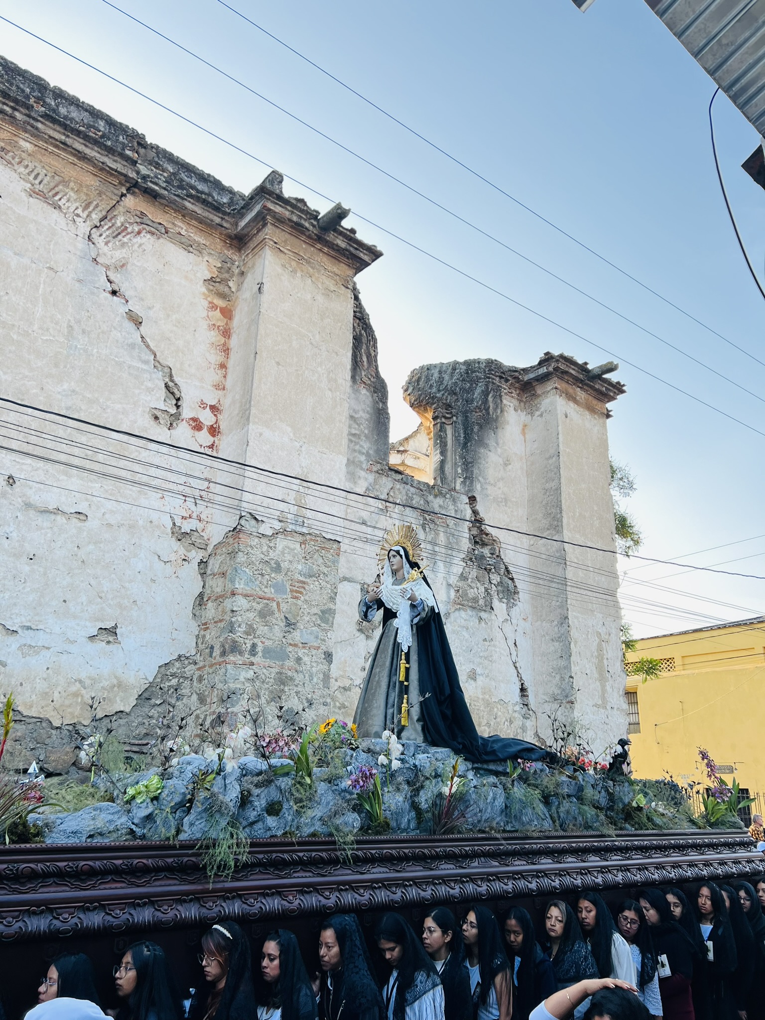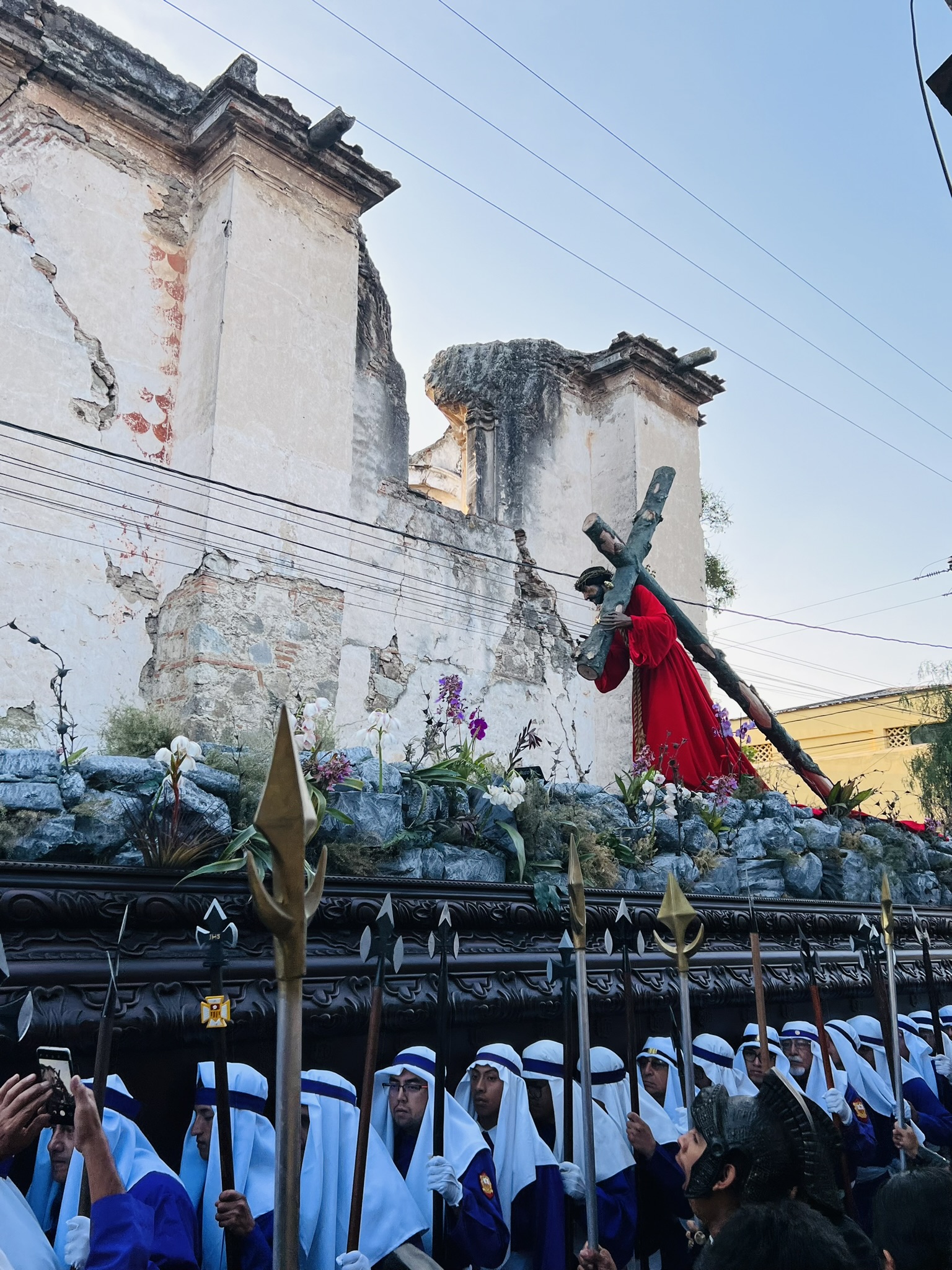 During Semana Santa, andas, or “floats” with statues of Jesus Christ and the Virgin Mary are carried through the cobblestoned streets of Antigua. Each float with Jesus is carried by cucuruchos or “bearers”. The larger floats that I saw during Semana Santa required over 100 cucuruchos to carry, dressed in purple robes with white waistbands. The floats with the Virgin Mary are often carried by women dressed in all black. Weighing at up to 7,000 pounds each, the wooden floats sway from side-to-side with each step the carriers take.