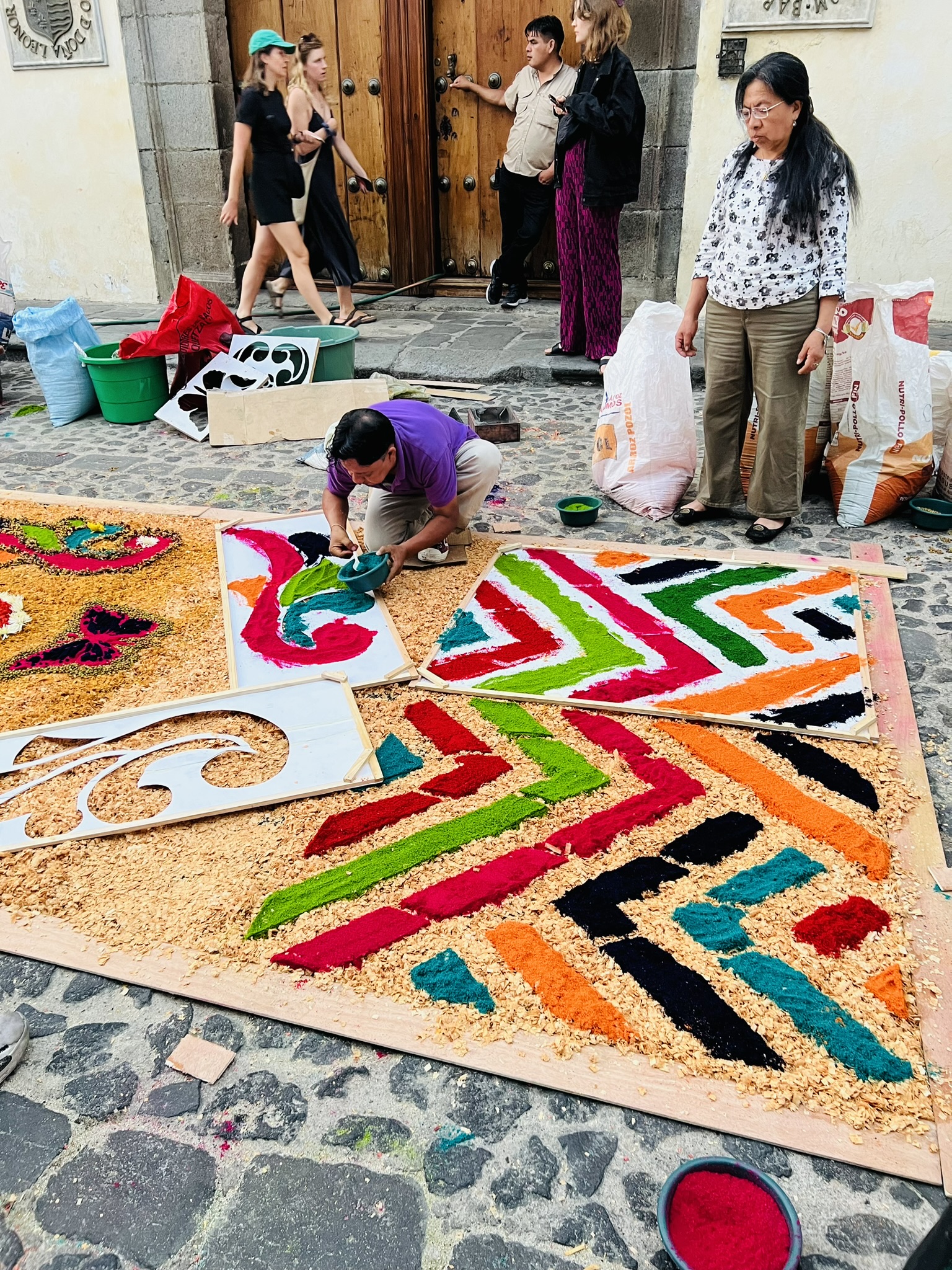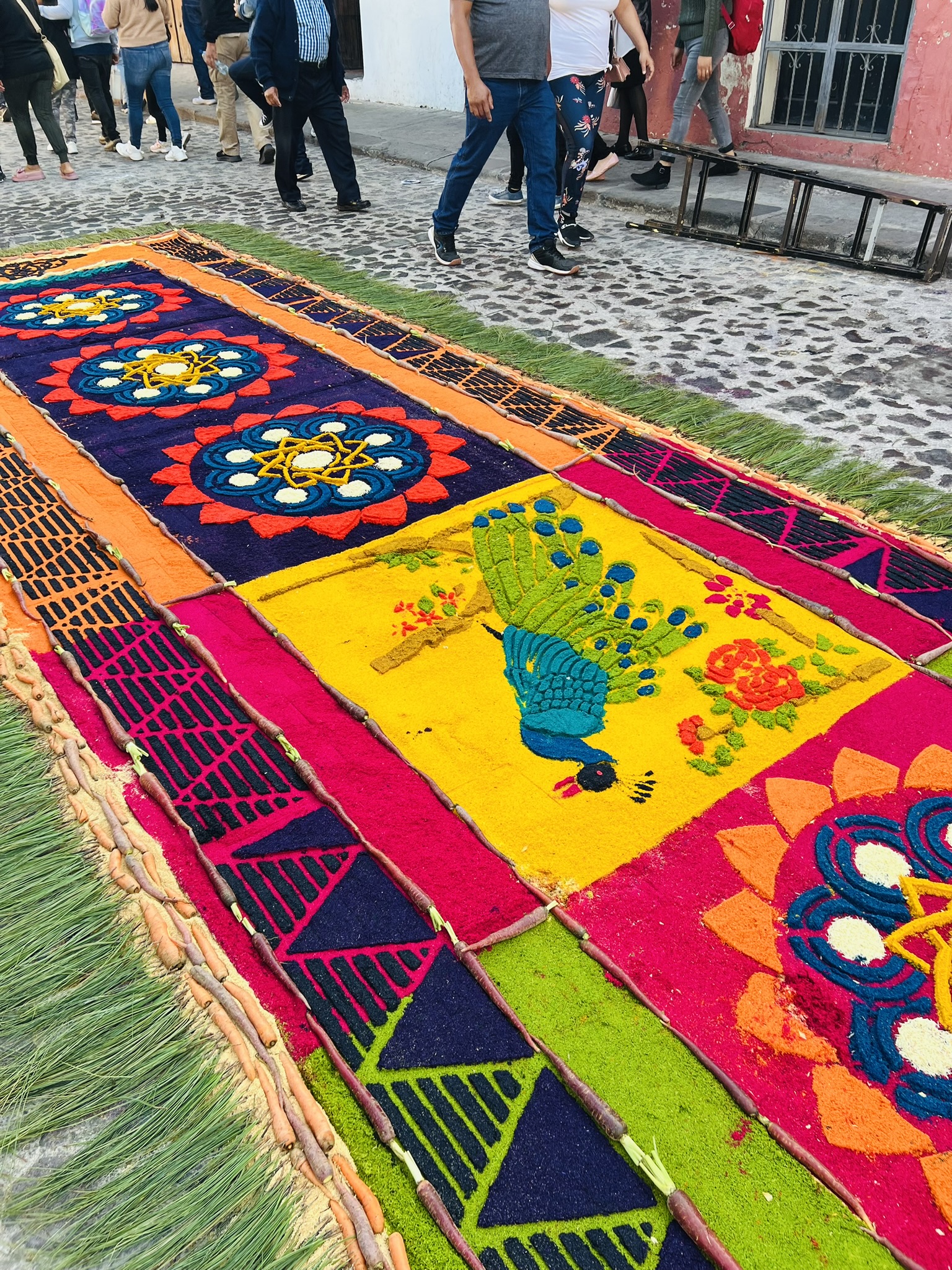 Aside from the processions, the streets of Antigua are also decorated and lined with beautiful alfombras, or carpets. The carpets are made by the families that live in Antigua and they’re often planned months in advance. The carpets are typically made with vibrantly colored sawdust, but I also saw one made with pistachio shells as well as other plants, flowers, and vegetables. The carpets are made just a few hours before the processions are set to make their way down the streets and are immediately cleaned up once the processions pass. I highly recommend visiting during the early morning hours to catch the beautiful carpets in full glory before the processions pass by.
