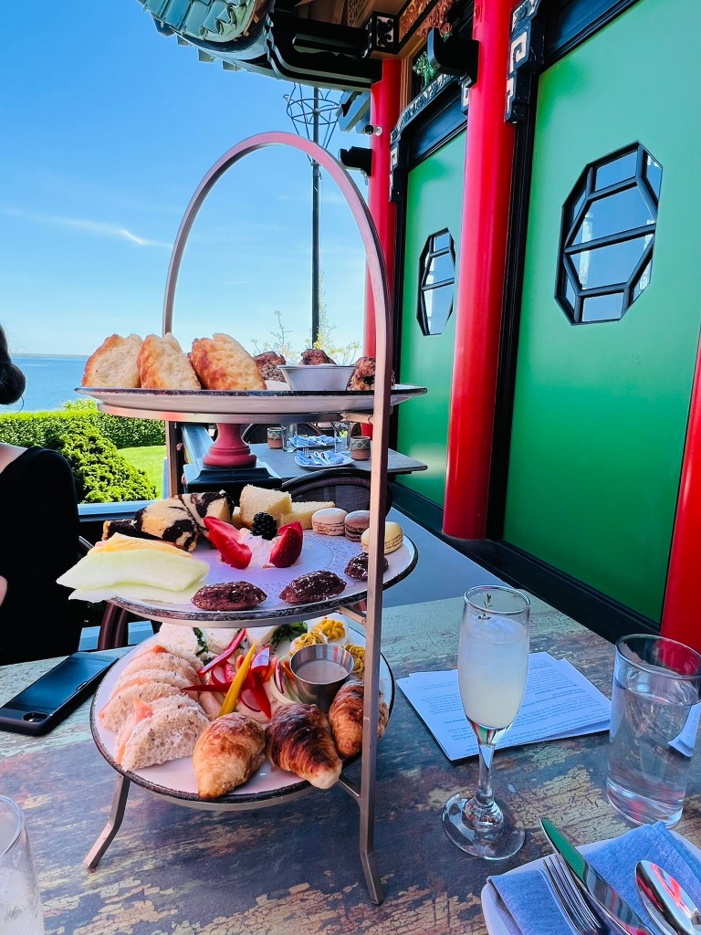 After touring Marble House, we stopped by the Chinese Tea House for a tea break. Once a spot where Alva Vanderbilt held numerous fundraising tea parties, the Chinese Tea House sits atop the cliffside behind Marble House, overlooking the Atlantic Ocean. They offer an afternoon tea prix fixe menu, which includes a welcome beverage (alcoholic or non-alcoholic), a tea tower scones, sweets, and tea sandwiches, as well as tea and an entree. At the time of writing, it cost $65 per person. As someone who is a huge fan of afternoon tea, this was an amazing way to finish our trip to the Marble House.