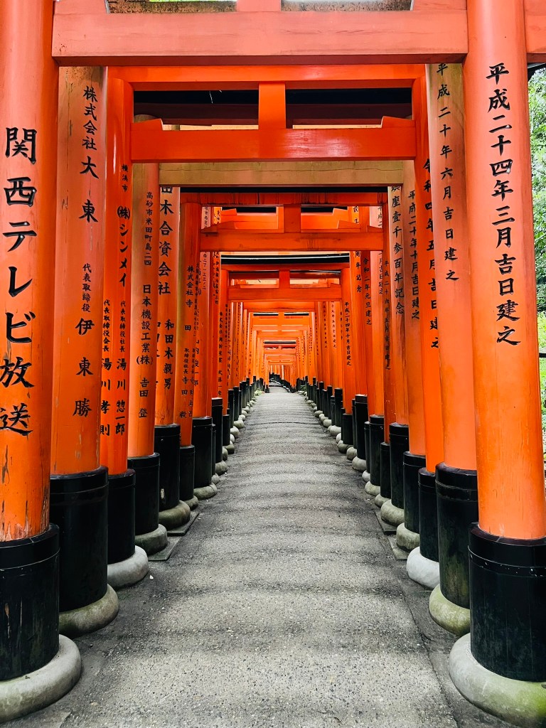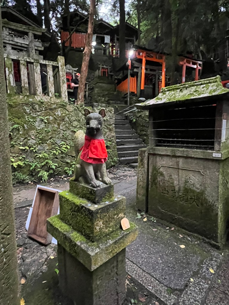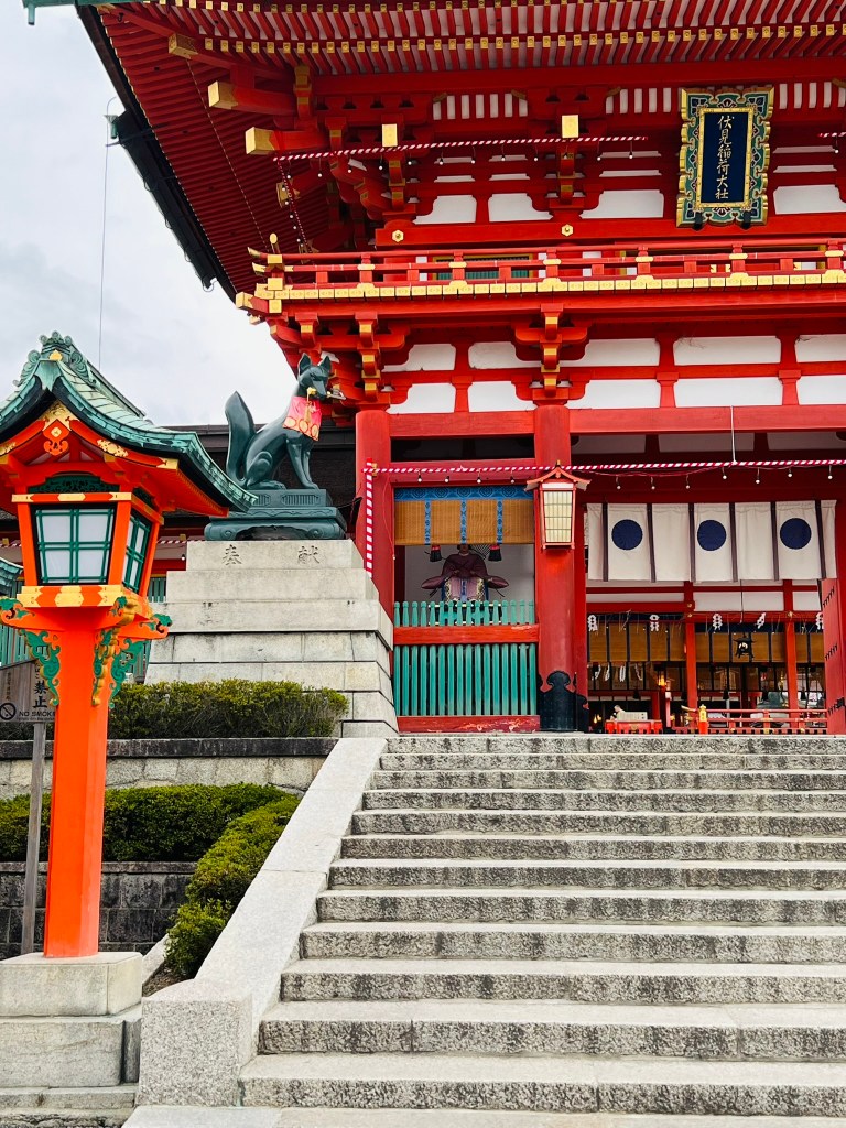 Our last activity of the day in Kyoto was the “old” activity. In my opinion, one cannot go to Kyoto without paying a visit to Fushimi Inari Shrine. Fushimi Inari Shrine is the central headquarters for 40,000 shrines that pay tribute to Inari, the Shinto god of rice, sake, and prosperity. Foxes are thought to be Inari’s messengers, so you’ll see many fox statues and figures all over the property.