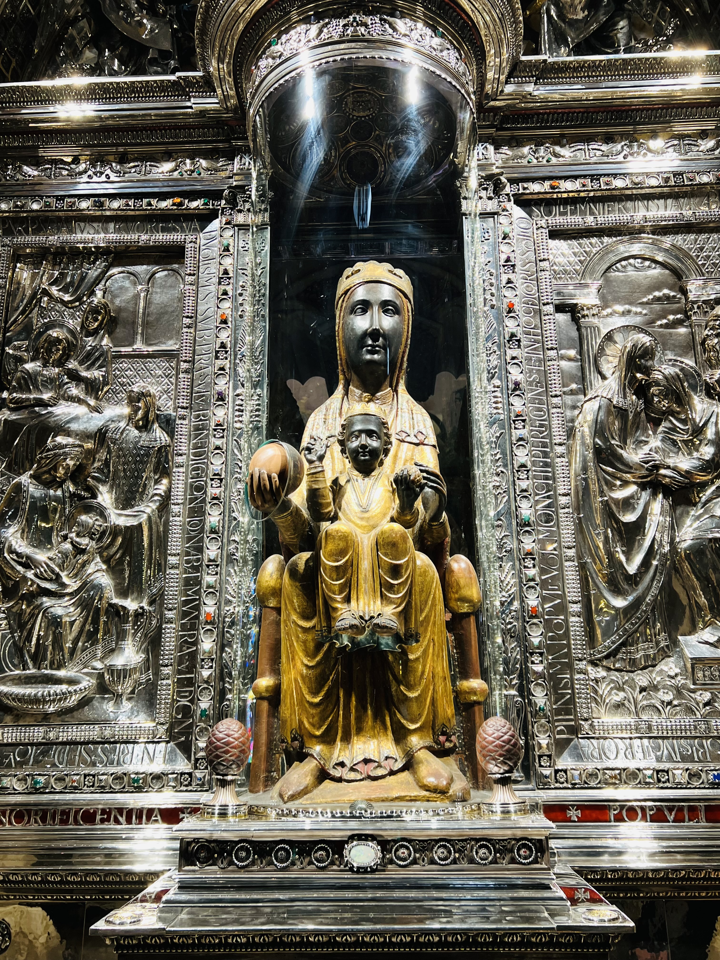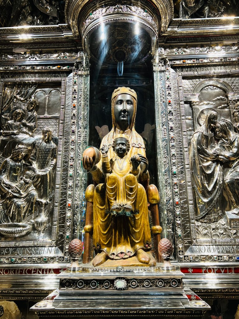 The highlight of a visit to Montserrat is Santa Maria de Montserrat Abbey. The Benedictine monastery is the spiritual heart of Montserrat and houses the famous Black Madonna statue (La Moreneta), a revered symbol of Catalonia. The Black Madonna, or “La Moreneta,” is a 12th-century Romanesque wooden statue of the Virgin Mary and baby Jesus. According to legend, the statue was discovered in a cave by shepherds in the 9th century, guided by a divine light. It has since become a central symbol of Catalan identity and devotion.