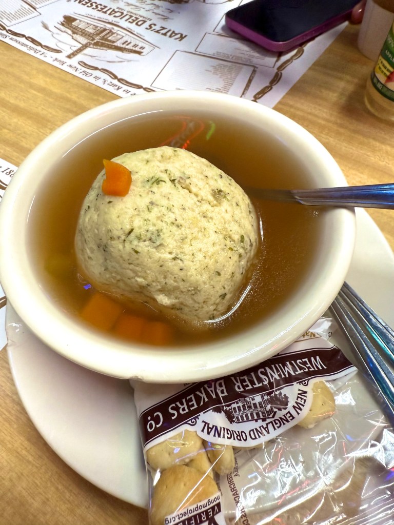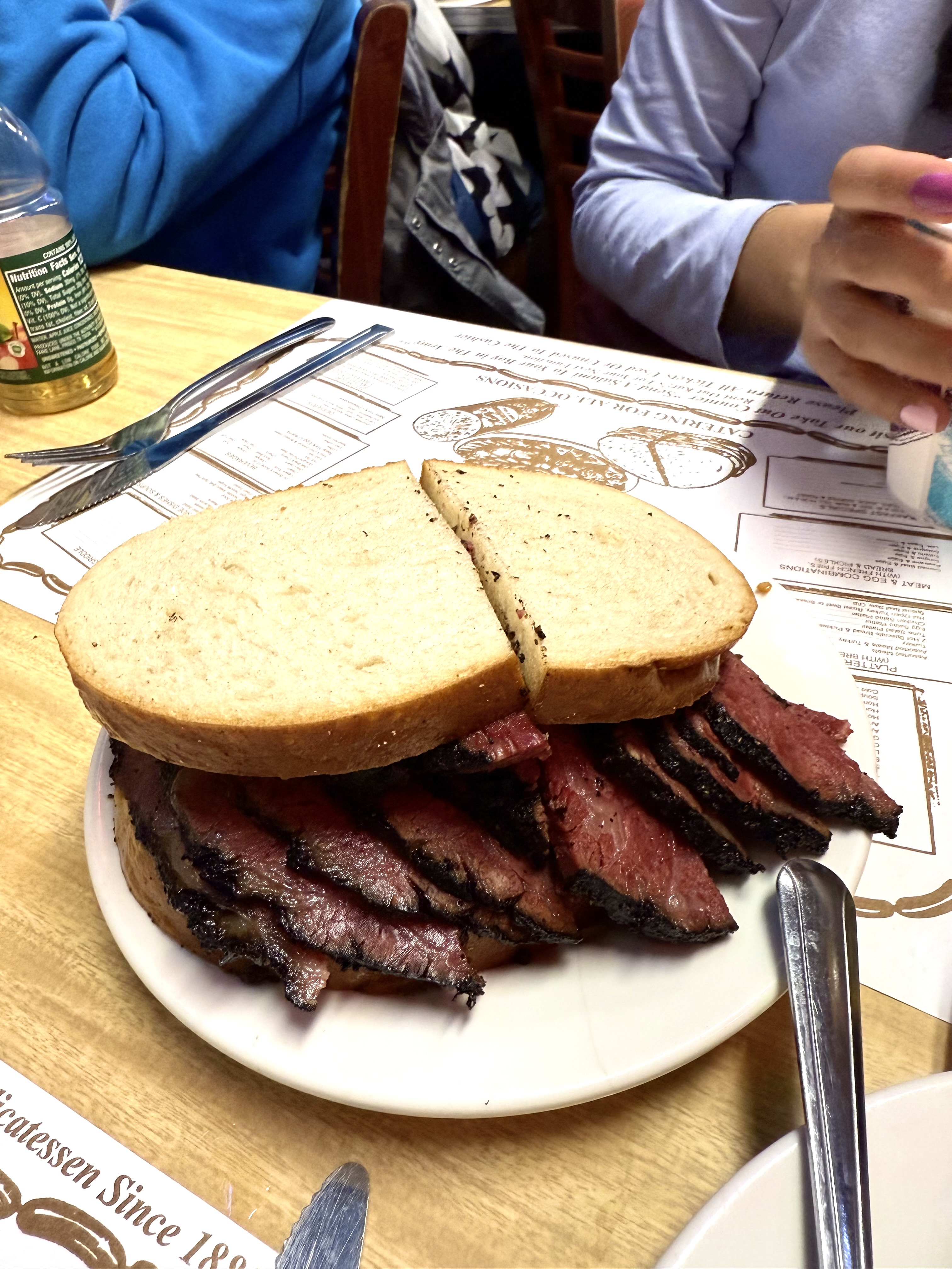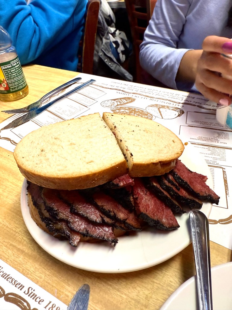 The second stop is just across the street at Katz’s Delicatessen, a famous Jewish deli in the Lower East Side. Established in 1888, it has become an iconic institution in New York City, renowned for its pastrami on rye sandwiches. They use a traditional slow-curing method, which takes up to 30 days, which makes the pastrami super juicy with that peppery, smoky crust. They offer both self-service dining, where you order at their counter or dine-in with waiter service. The counter is part of the experience, but if you’re feeling overwhelmed, waiter service is just as good. Make sure you have their classic pastrami sandwich with a dab of their house mustard. And I highly recommend their Matzo Ball Soup as well!