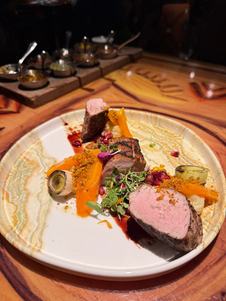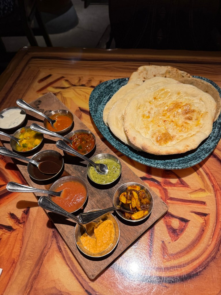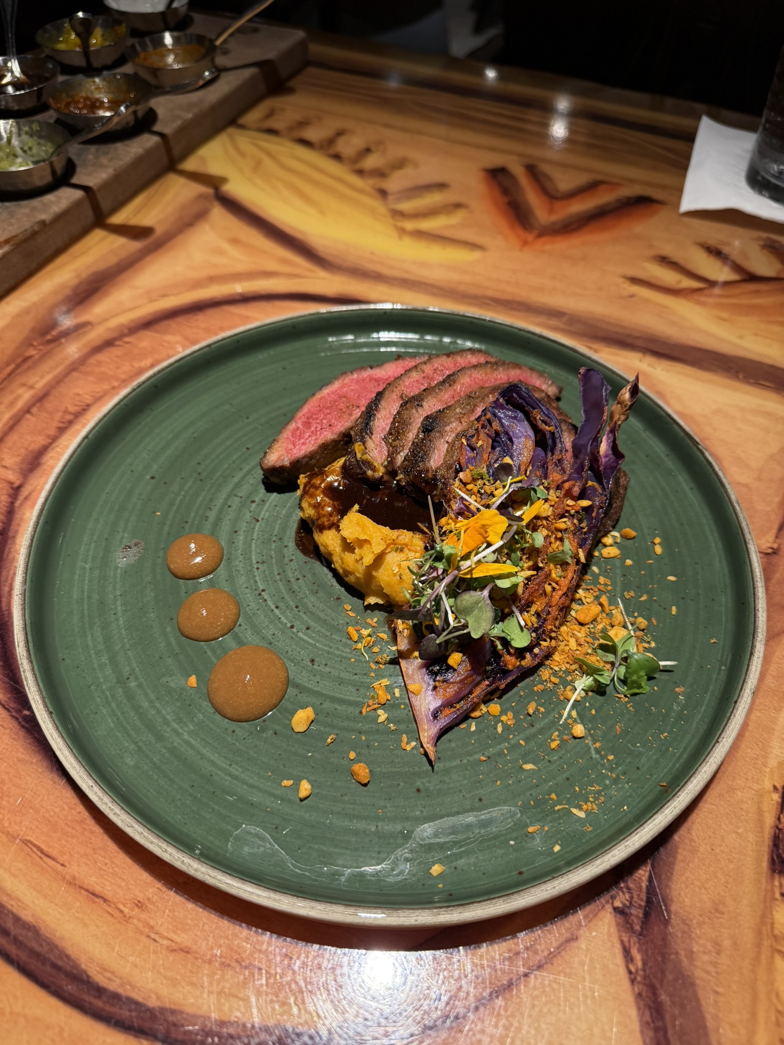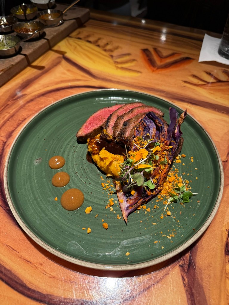 For our appetizer, of course we had to order their signature dish, the Indian-Style Bread Service with five breads and nine accompaniments. The five breads include Traditional Naan, Garlic-Ginger Naan, Spiced Naan, Onion Kulcha, and Paneer Paratha. The nine accompaniments feature Cucumber Raita, Roasted Red Pepper Hummus, Mango Chutney, Tomato-Date Jam, Tamarind Chutney, Coriander Chutney, Garlic Pickle, Red Chile Sambal, and Spicy Jalapeño-Lime Pickle. This was such a hearty and fun appetizer. I really enjoyed just mixing and matching all the different “breads” and “sauces’. My favorites included the mango chutney, the tomato-date jam, and the picked garlic. The “spicy” sauces actually had a bit of a kick! X’s main, the Mbavu ya Chuma was cooked to perfection and had an excellent sweet potato and coconut puree. I also highly recommend the African Mai Tai, which features STARR African Rum and is a great spin on the traditional Mai Tai.