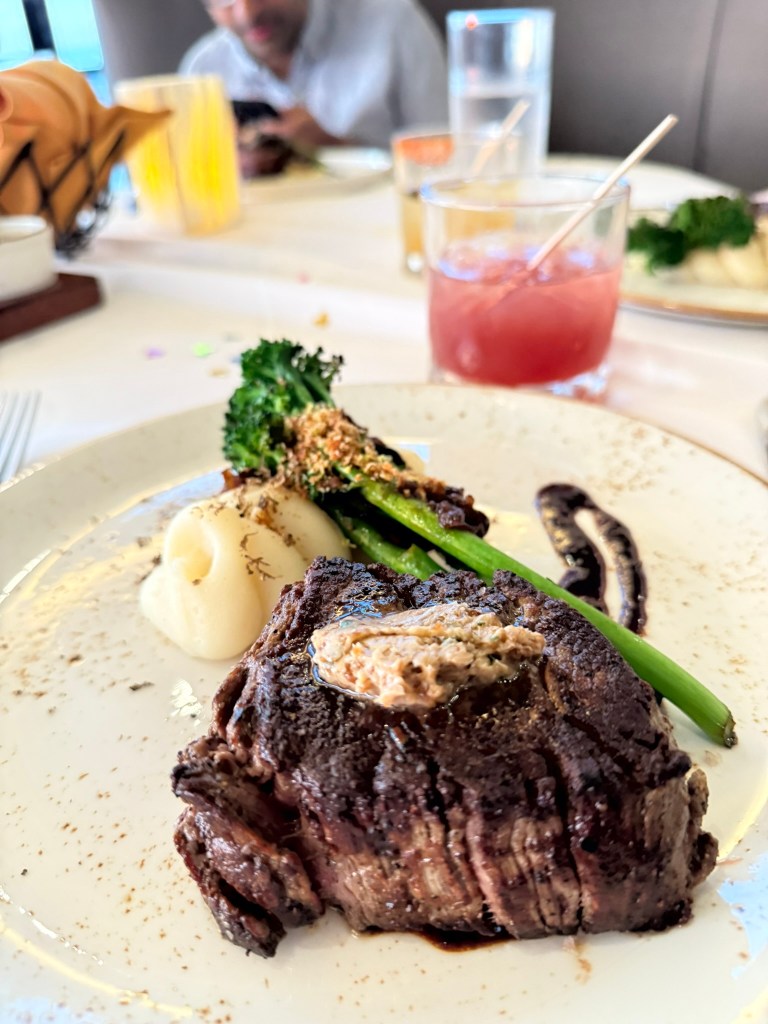 Located in Disney’s Yacht Club Resort, Ale & Compass features New England comfort food and classic seafood dishes in a coastal-inspired restaurant. The restaurant has a modern, coastal design with dark wood accents, brass fixtures, and a calm nautical vibe. If you arrive at the Yacht Club Resort early, I highly recommend going out to the deck for a walk. They have a cute lighthouse as well as great views across the lake to the Boardwalk. I was also told by my waiter that you can catch the 9PM Magic Kingdom fireworks on the deck.